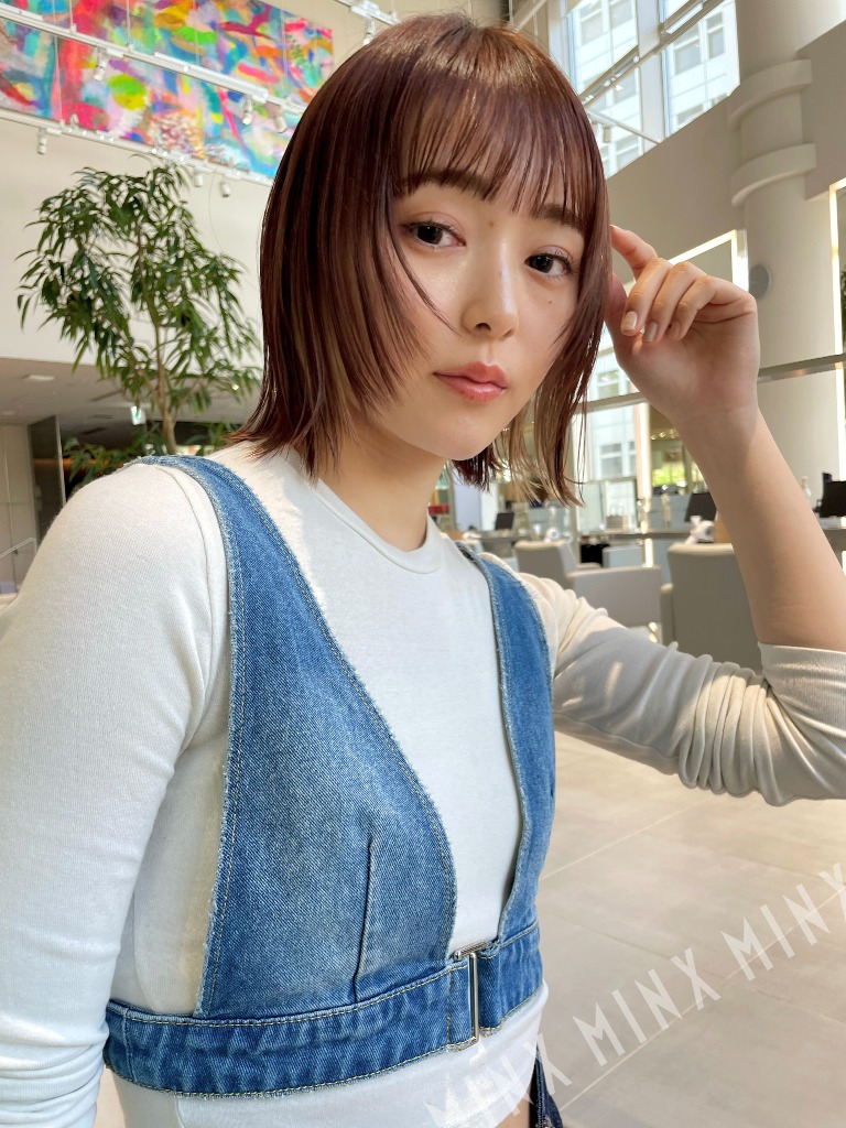- 後ろは軽く外ハネになるようにアイロンを通します。顔まわりはカットラインに合わせて少し丸みをつけます。