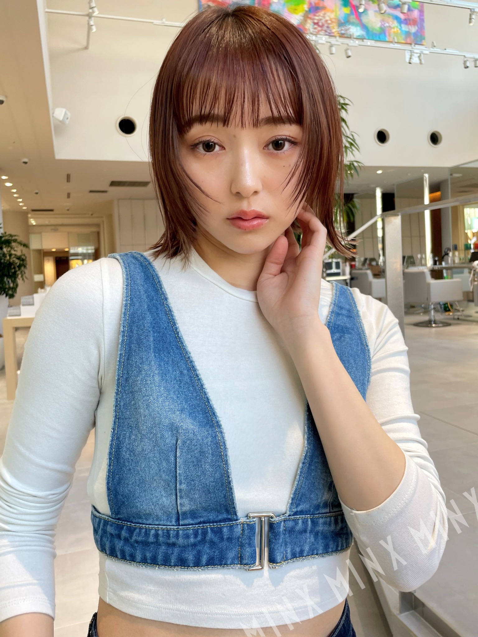 - 全体をワンレングスにカットします。顔まわりは生え際から2センチを分けとり、小鼻から繋がるようにハイレイヤーの切り口で繋ぎます。