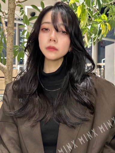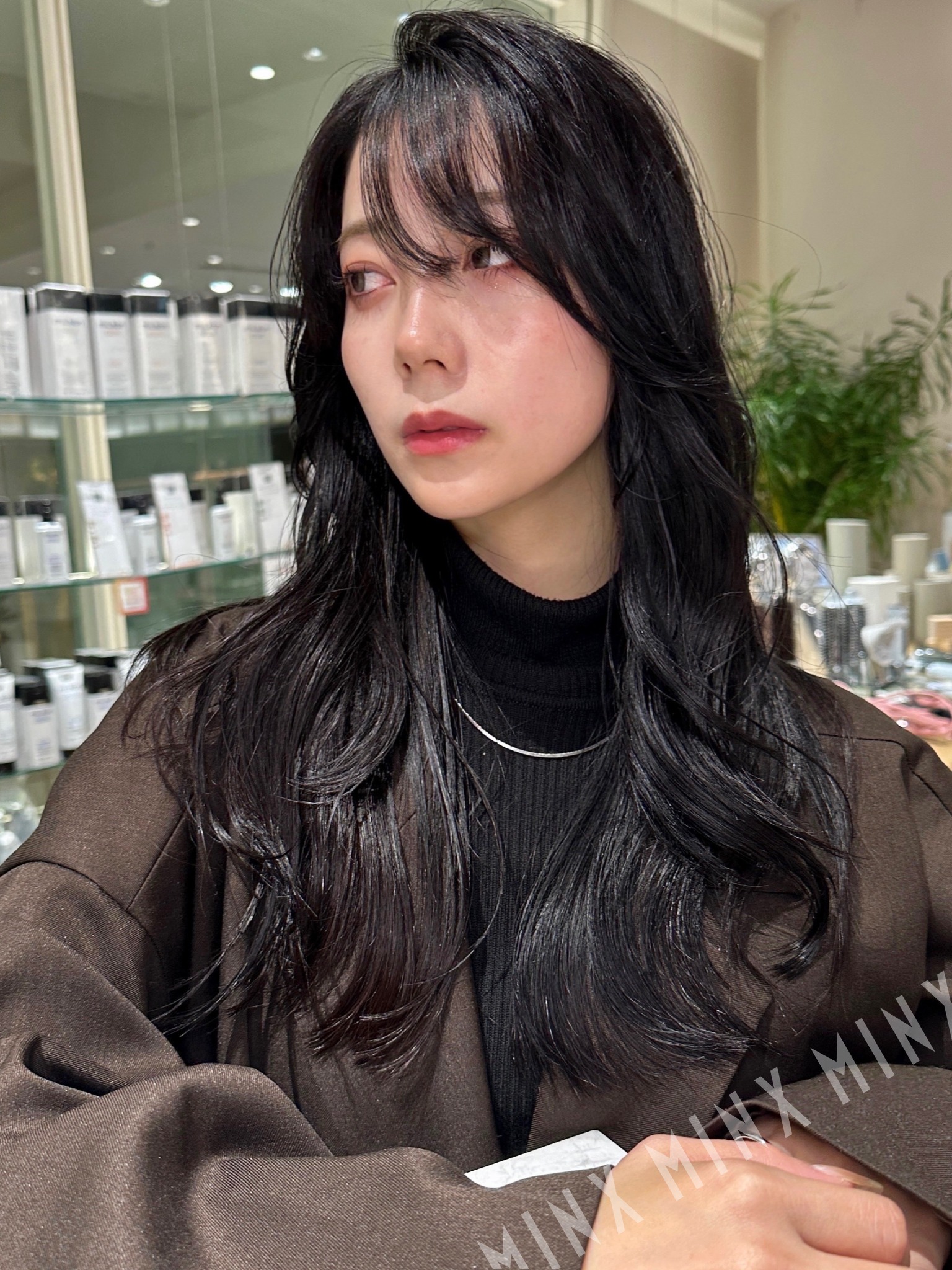 - ベースのカットはまとまり感を残したロングレイヤーのスタイル。毛先に厚みがあるので艶が出やすいカットです。ミドルからトップにかけてはレイヤーがしっかり入っているので巻いて動かしてあげると抜け感UP