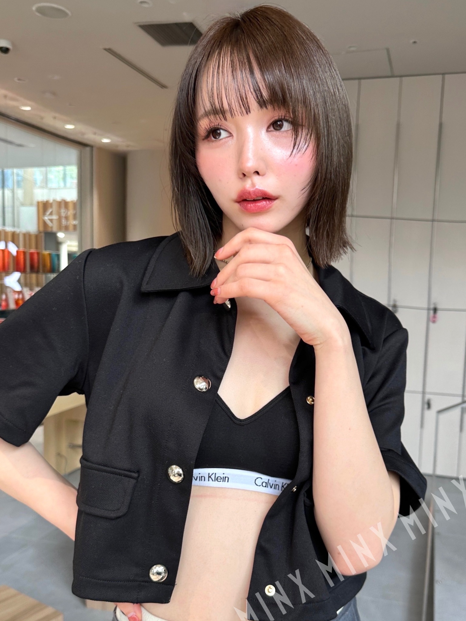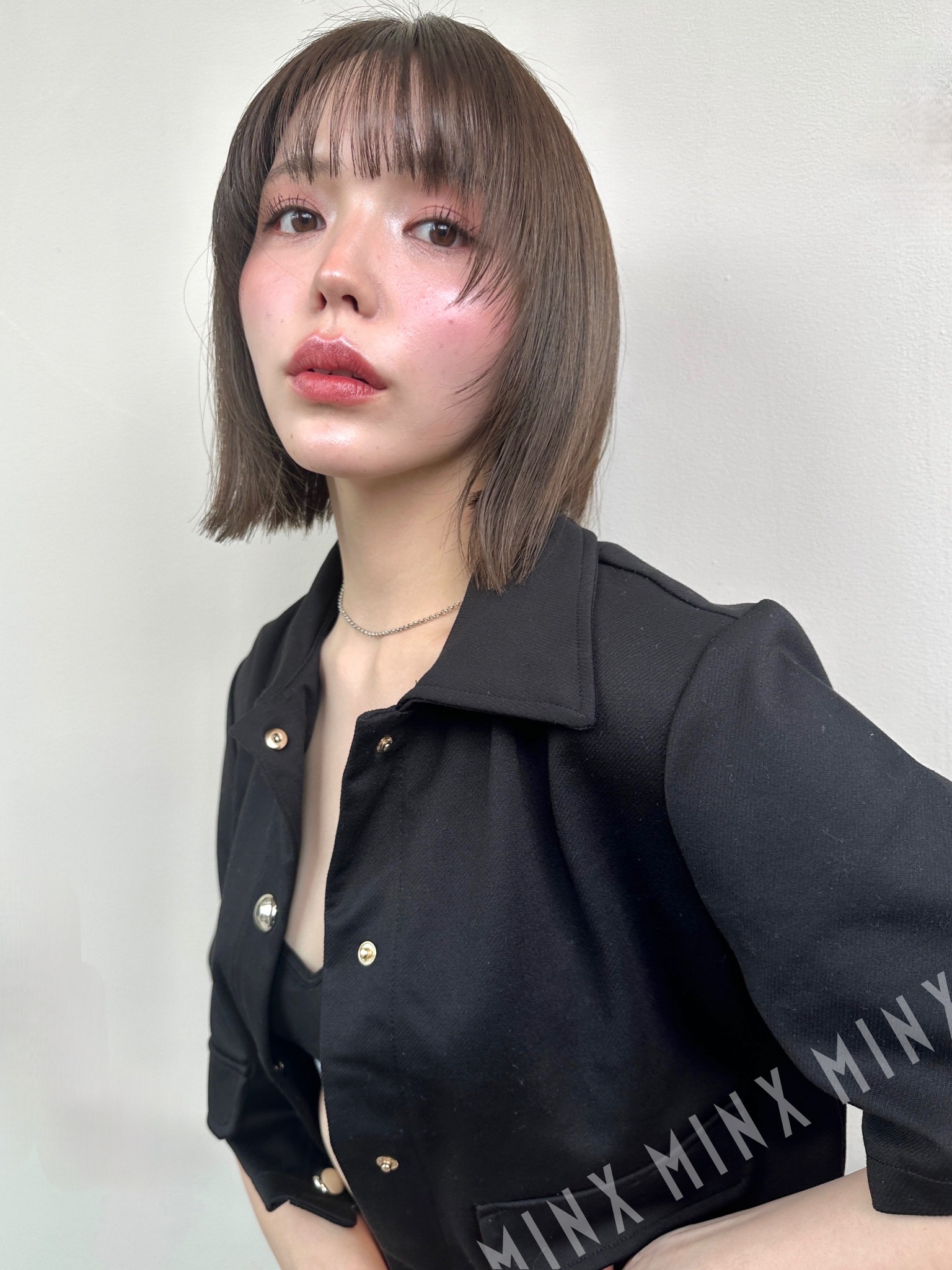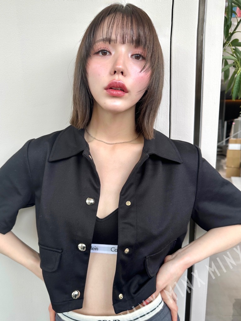 - アゴ下5cmの長さで設定したレイヤーボブのスタイル。顔まわりにはパラパラ落ちるフェイスレイヤーが目の辺りの高めの位置から入っています。