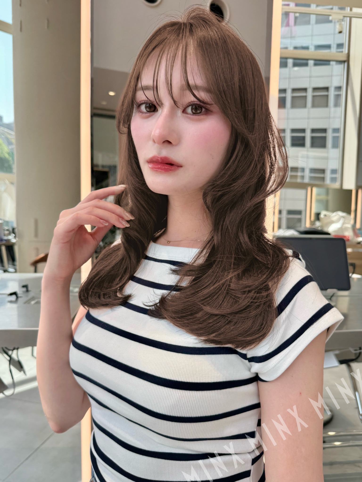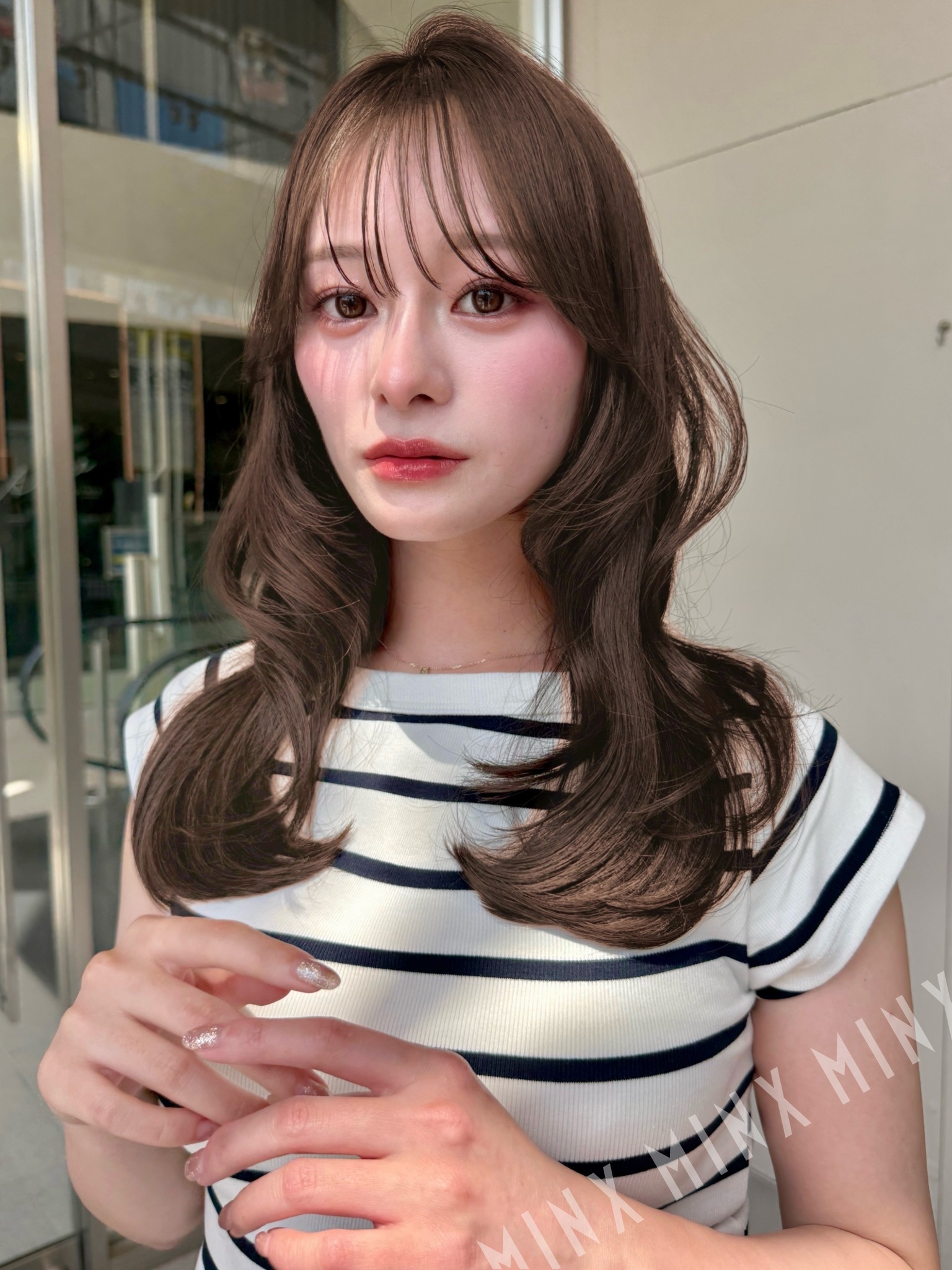 - レイヤーが入ったカットベースににフォワード巻きで最新韓国トレンドを意識したミディアムロングスタイルです。