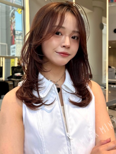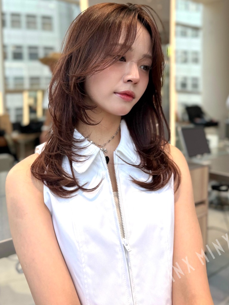 - 透け感抜群のハイレイヤーをワンカール軽く巻いてオイルで仕上げました。