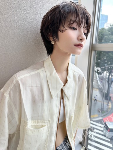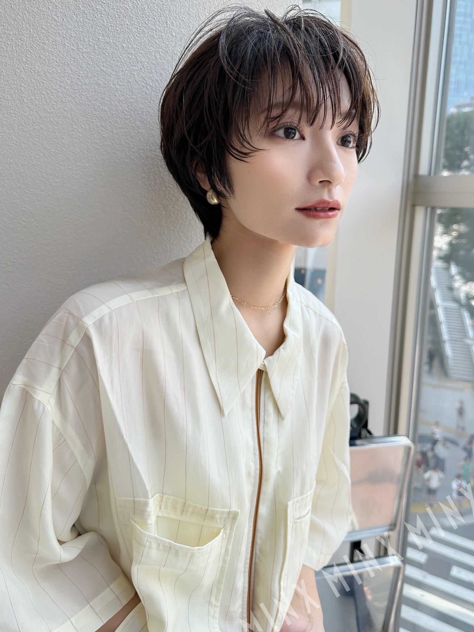 顔まわりに長さを残しつつ、トップに軽さを入れることで、柔らかさと立体感が出ています。前髪はシースルー気味に薄く作り、目元を強調しながら大人っぽさを演出。耳掛けアレンジも可能で、ナチュラルからモードまで幅広く対応できる万能ショートです。