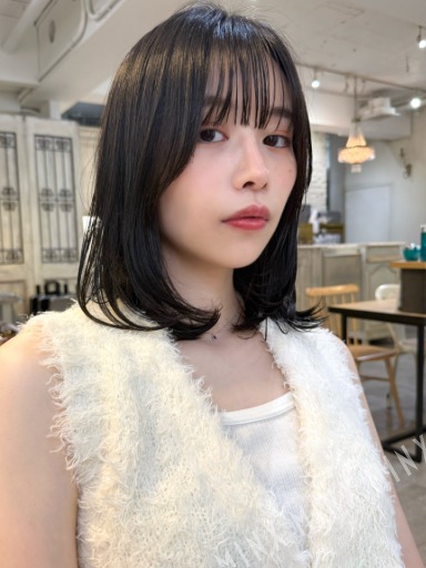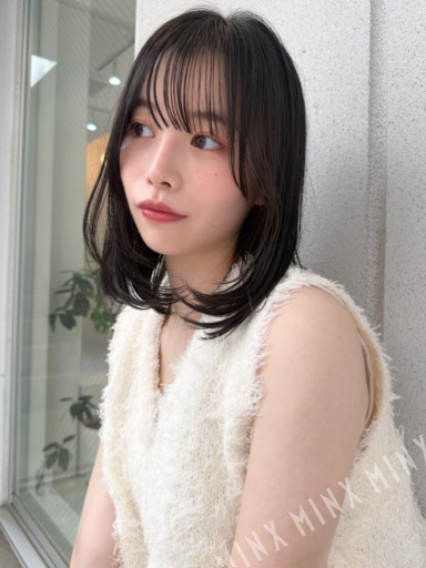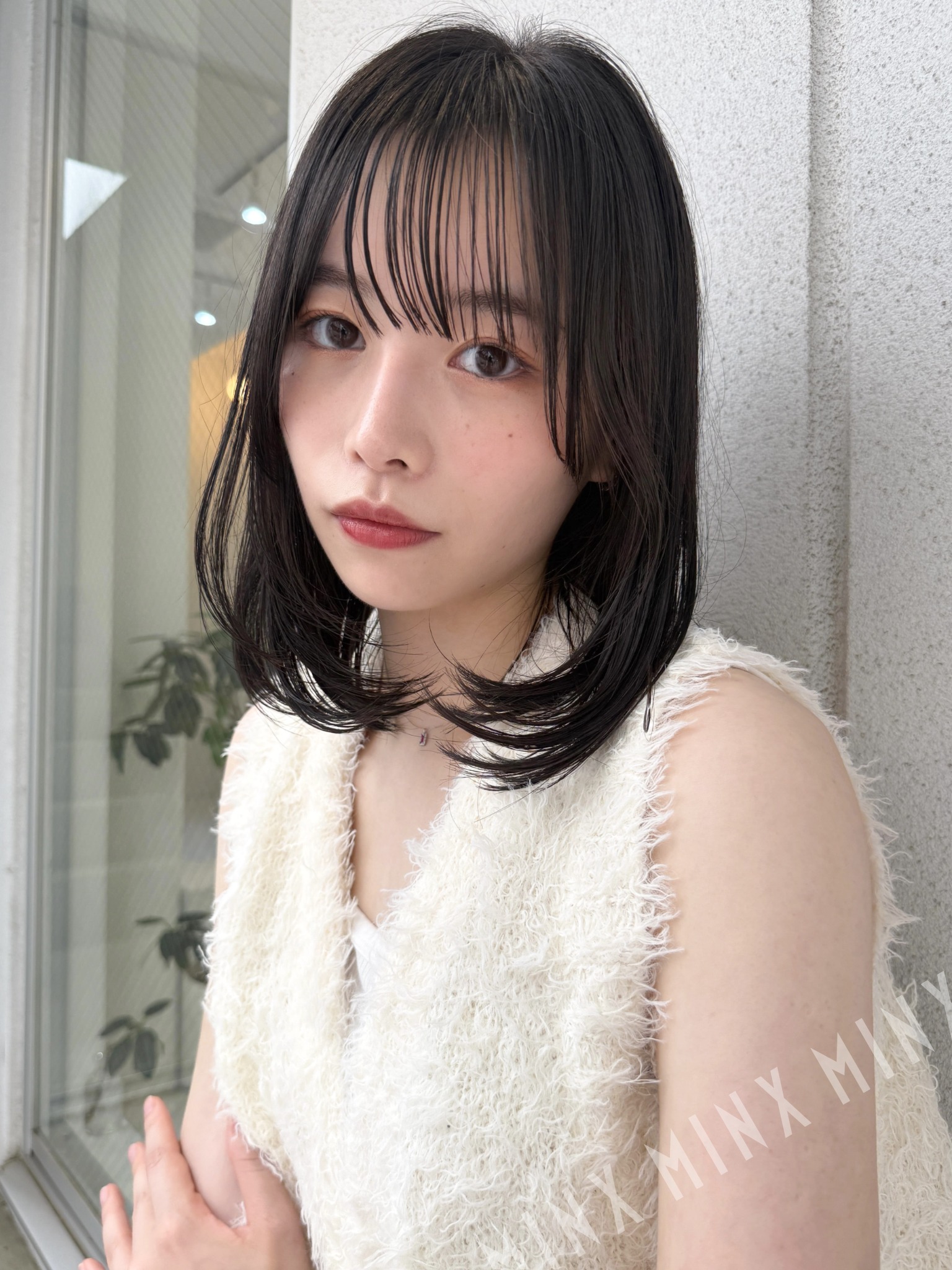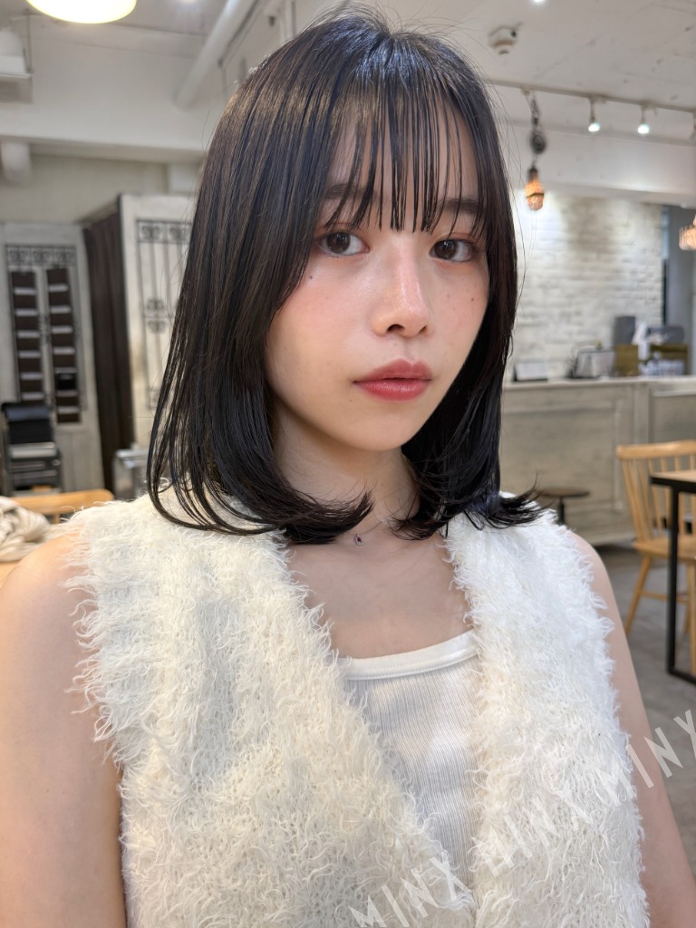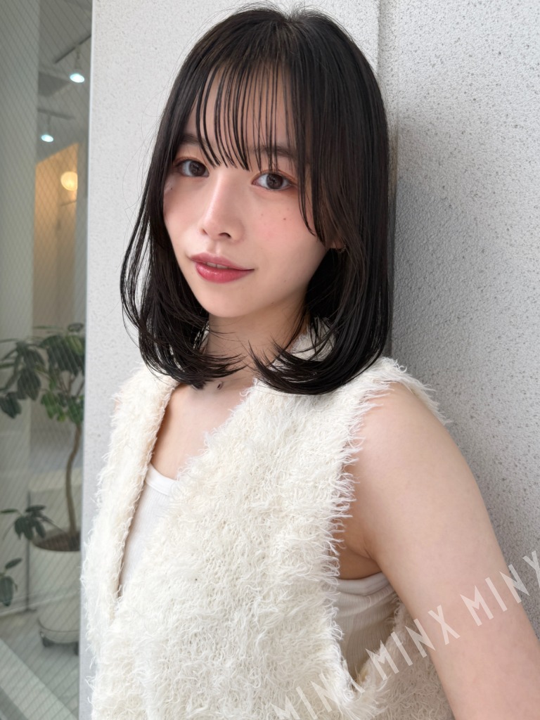 暗めの色なので前髪の量を少し少なめにして、おでこがみえるくらいにすると抜け感が出ます