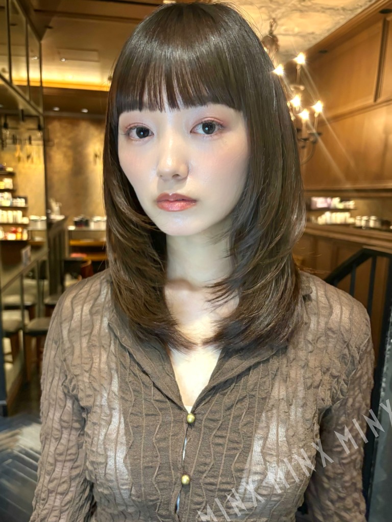 - ぱつっとした重めバングに軽さのあるレイヤーをいれることでメリハリのあるお洒落な雰囲気を叶えられます
