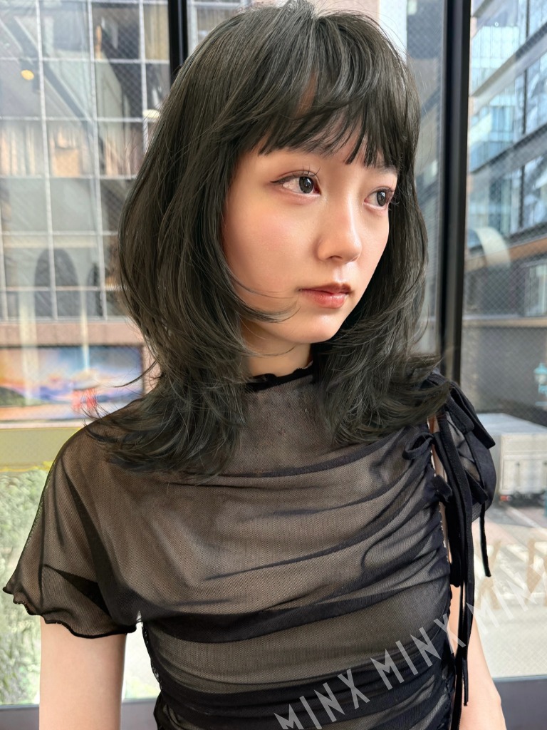 - ミディアムヘアに顎下あたりからレイヤーを入れたくびれスタイルです。