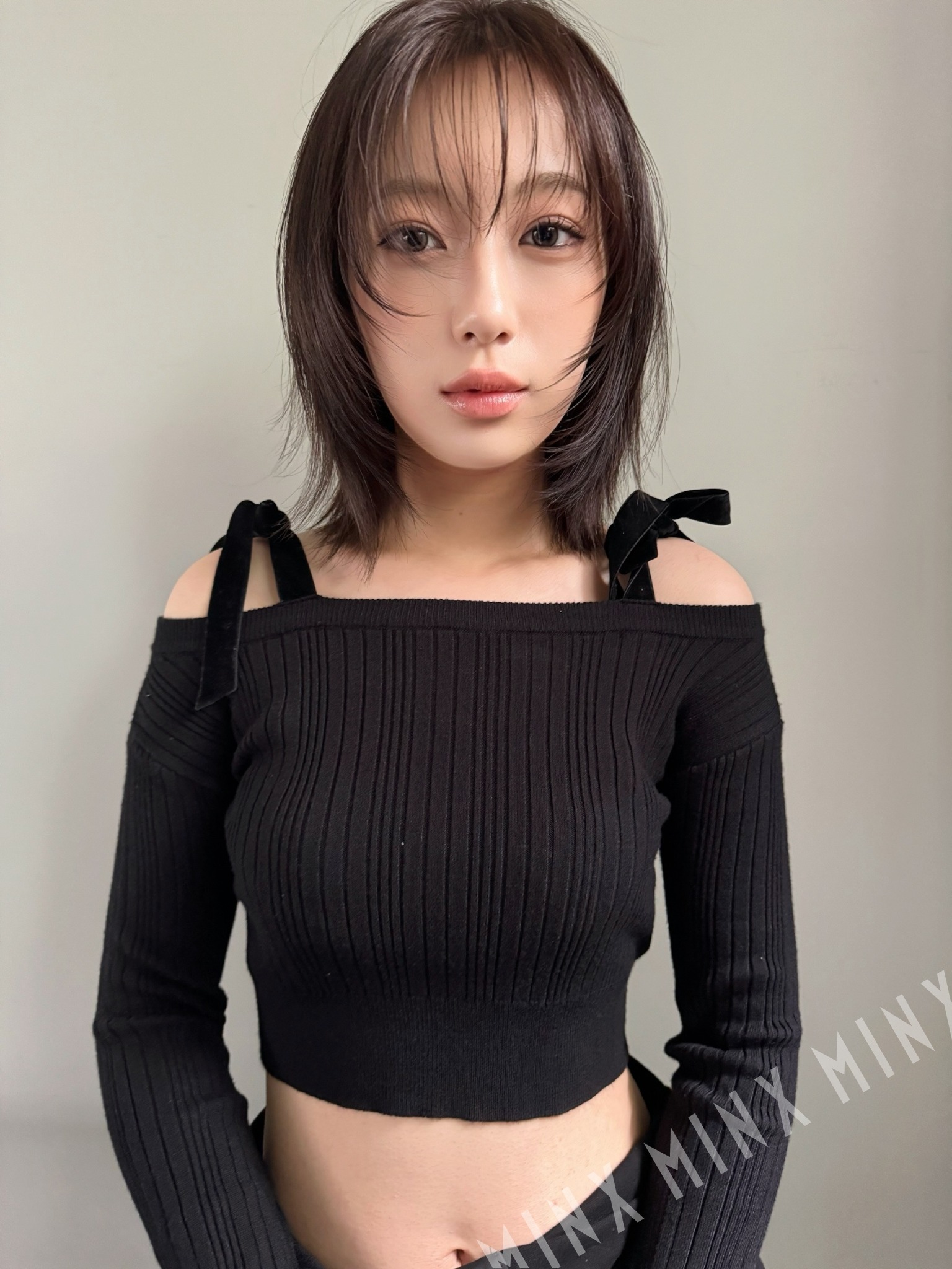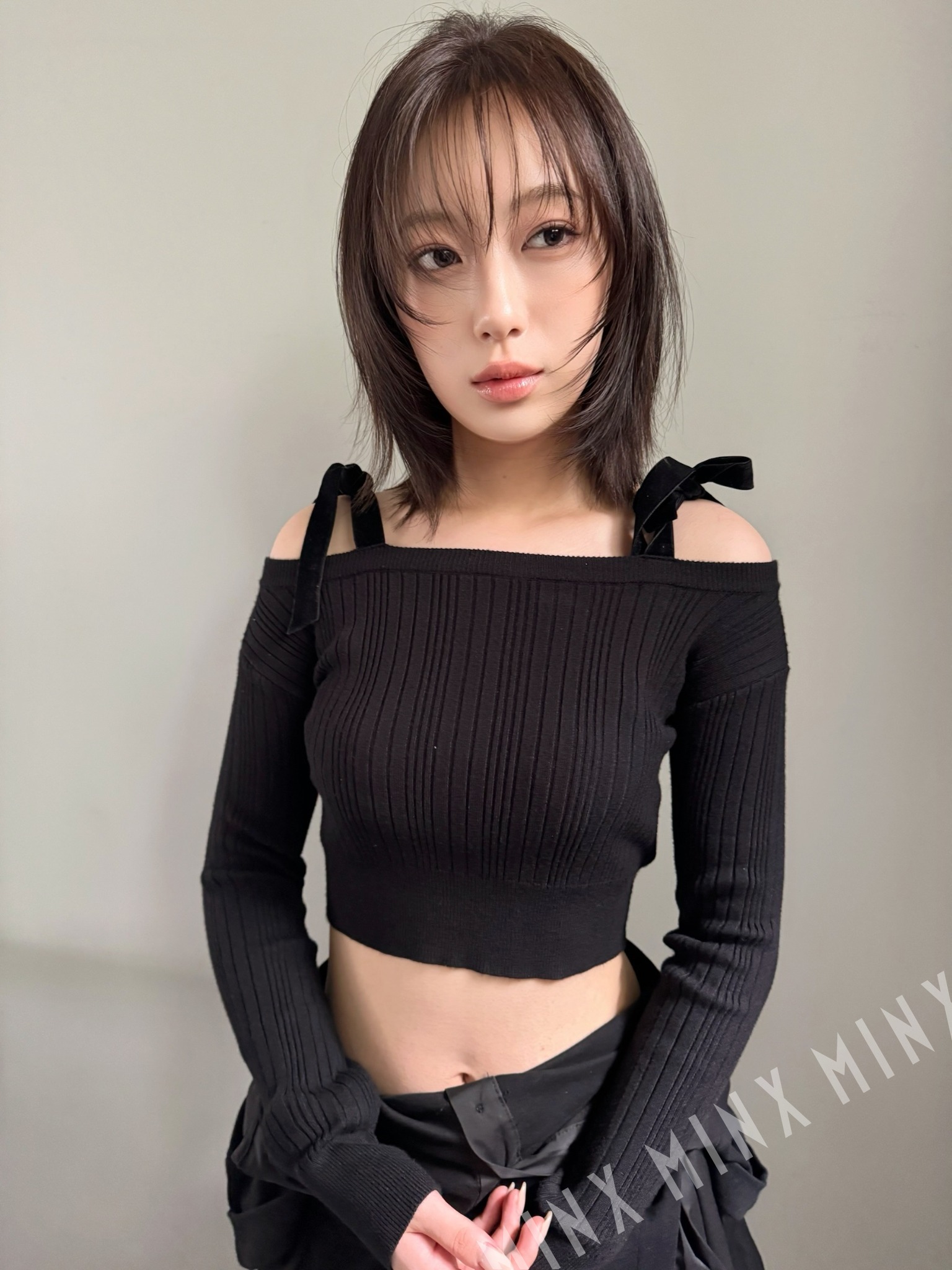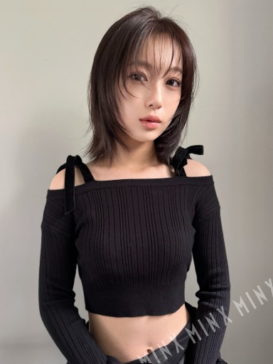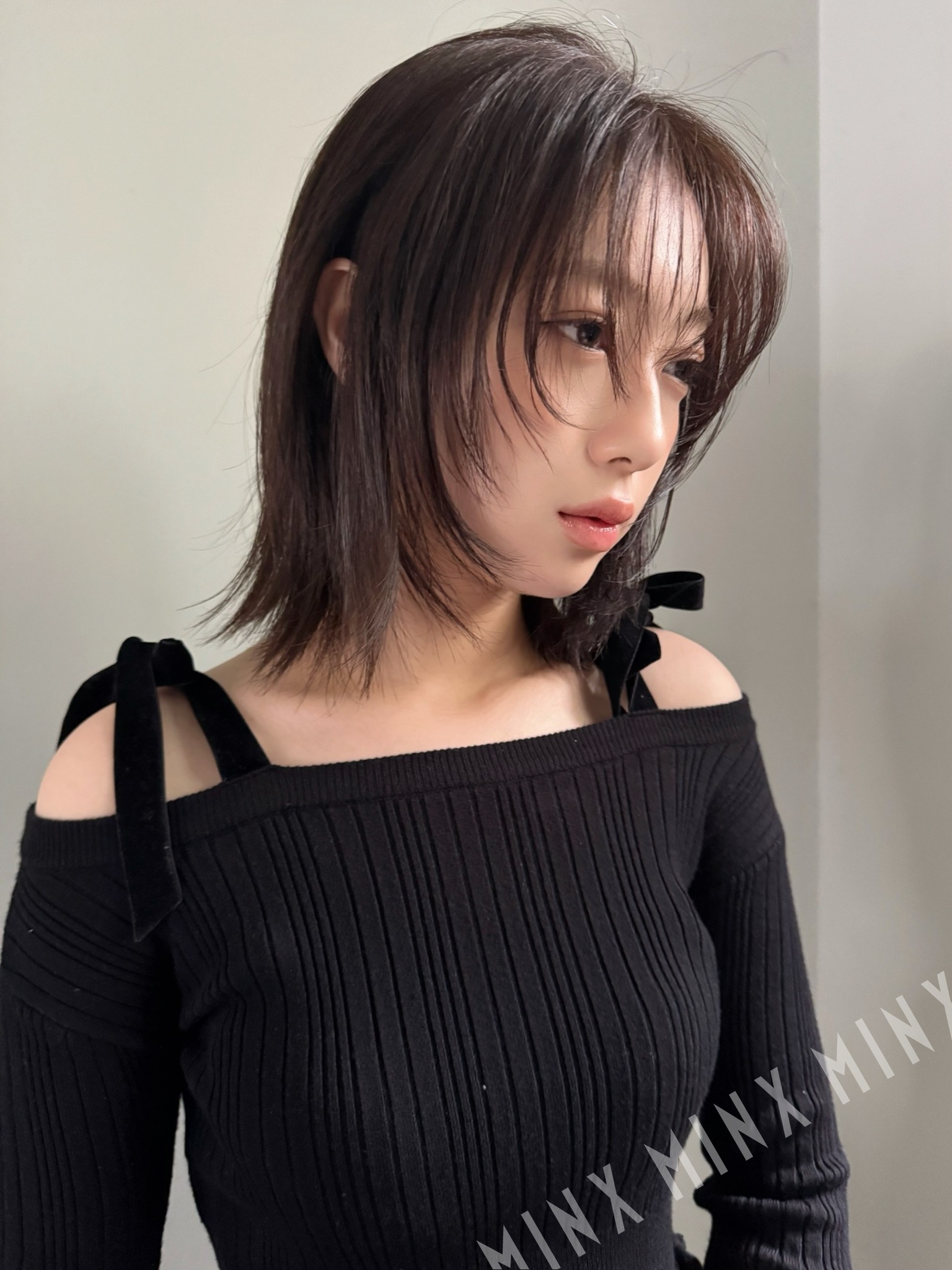 - ストレートアイロンで顔周りのレイヤーを生かして柔らかく、毛先は軽く外ハネに。