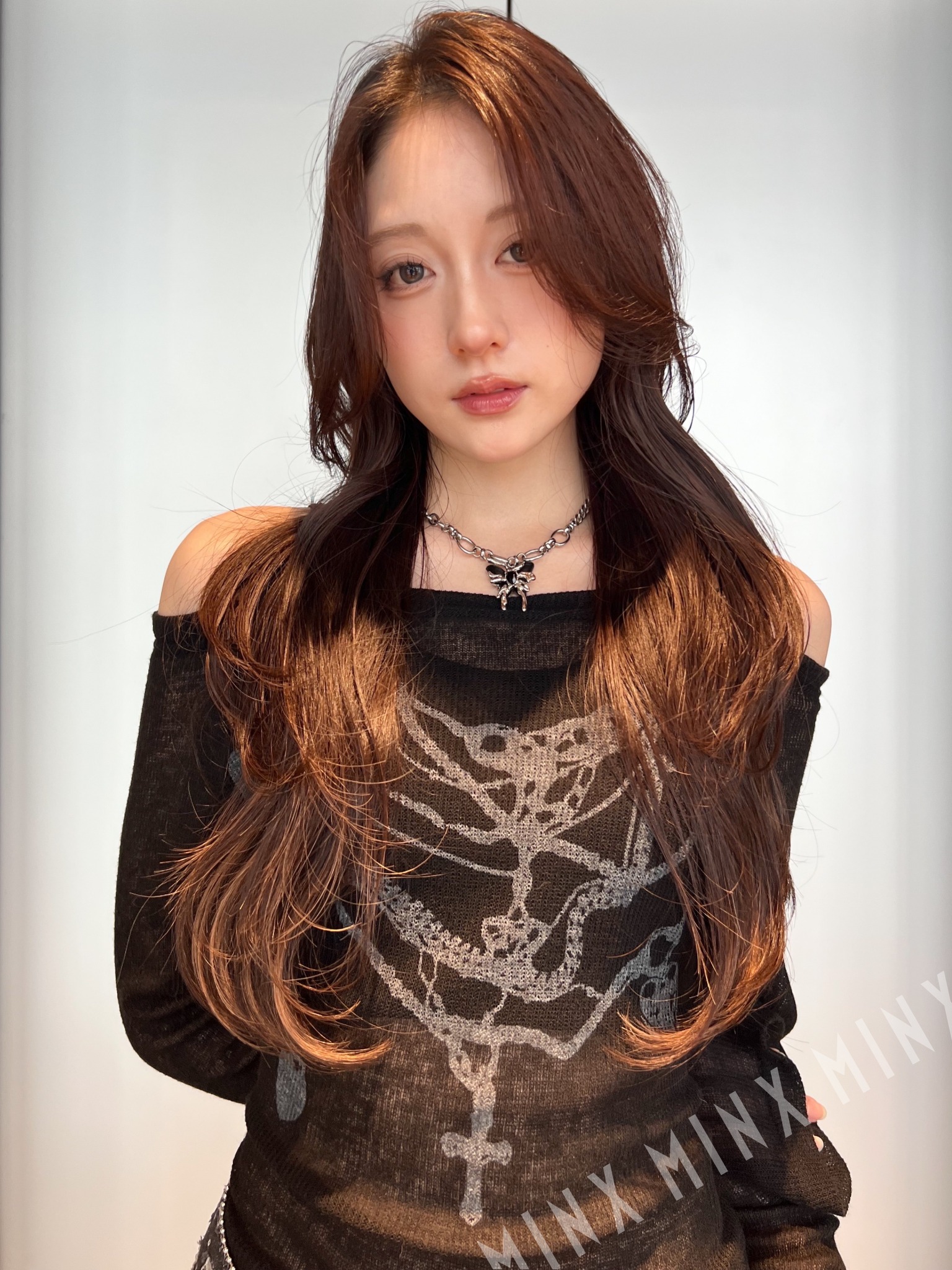 - 38mmのコテで全体を内巻きに、顔まわりはリバースに仕上げました・:*+