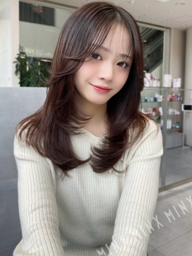 - 髪の毛の長さは鎖骨下ミディアムで顔まわりに高めのレイヤーを入れることで小顔効果のあるヘアスタイルになります。
