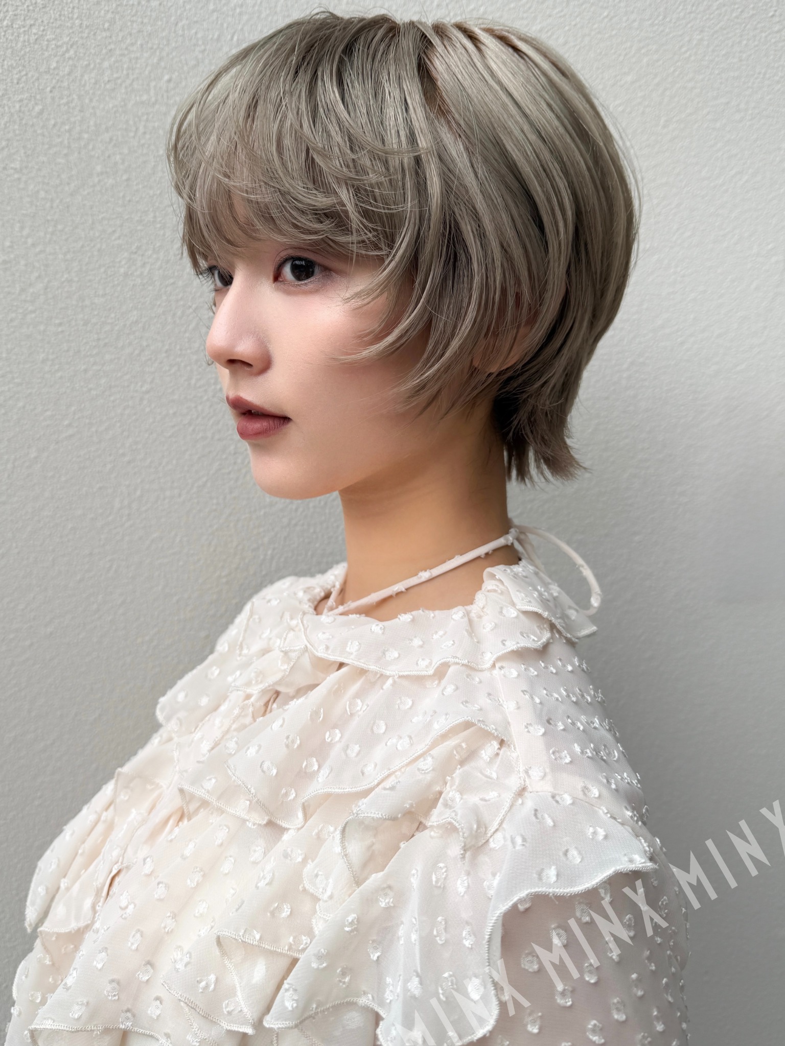 カラーは透明感たっぷりのグレーベージュで、くすみすぎない大人の寒色ヘア