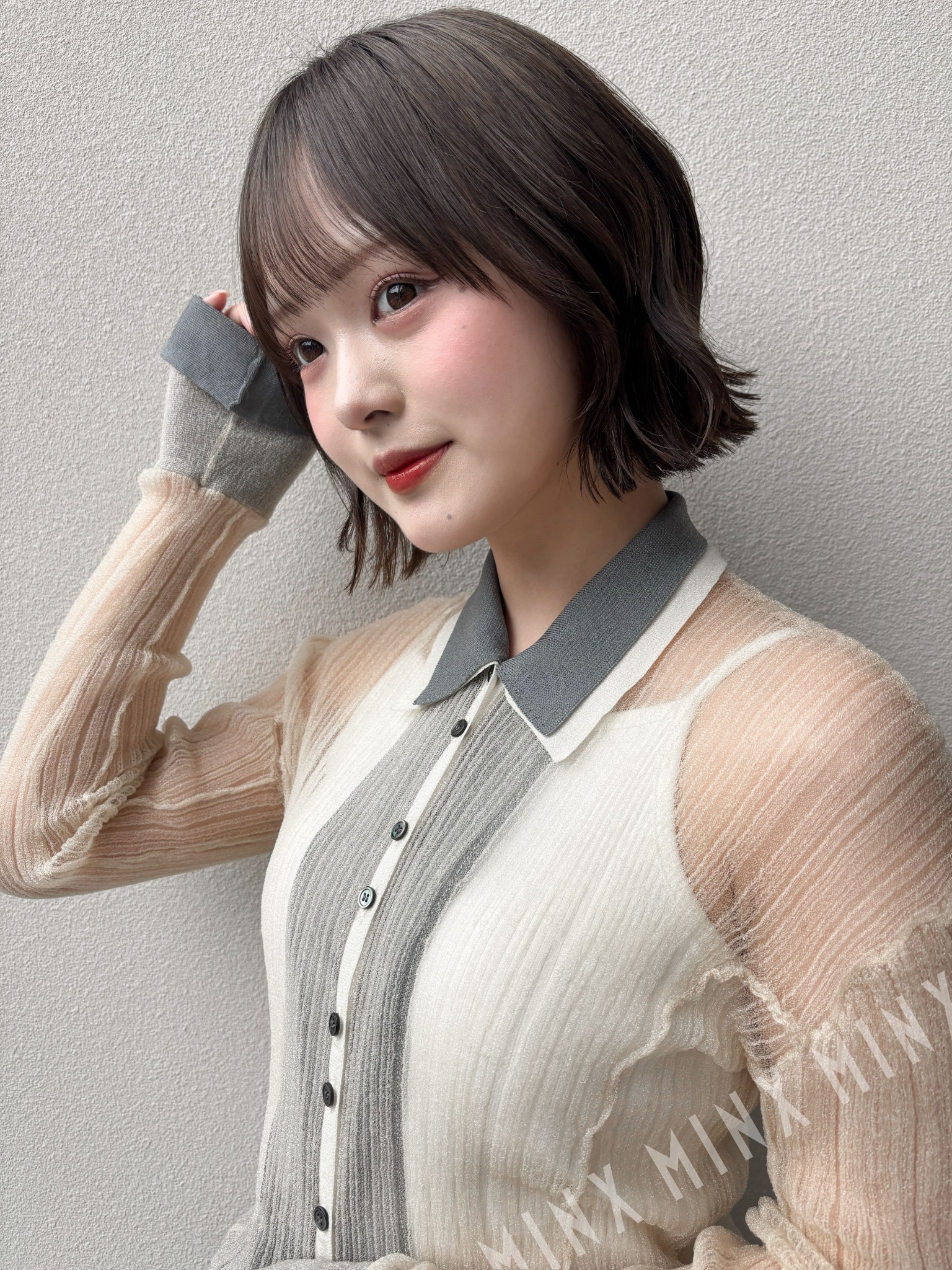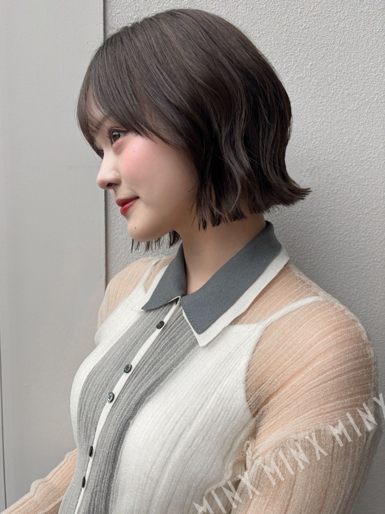 - 前髪とサイドバングはストレートアイロンで、ベースは26mmのアイロンで外ハネ、表面だけ32mmのコテでリバースに巻きました。