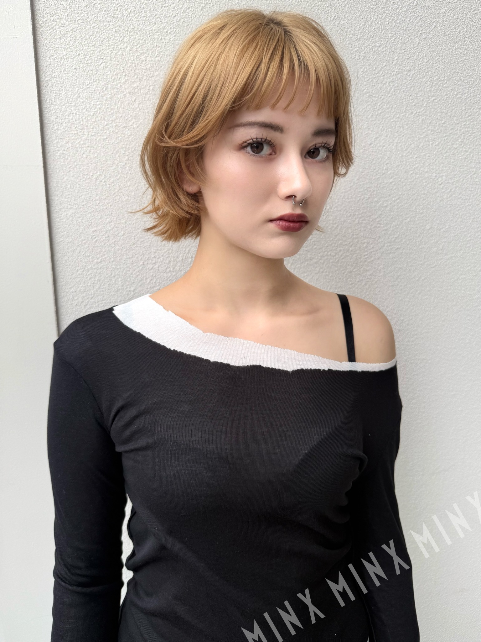 - アンダーをぱつっとしたボブにカットし、トップ、顔周りにしっかりレイヤーを入れたレイヤーボブスタイルです。