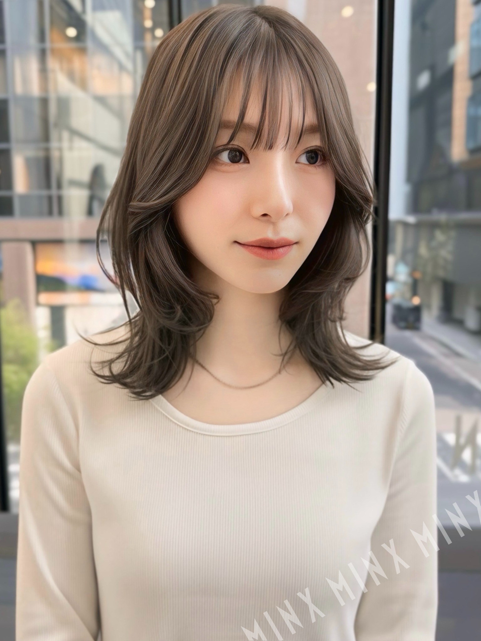 - 鎖骨の長さでカットし、顔周りとトップにレイヤーを入れたくびれミディアムレイヤースタイルです。
