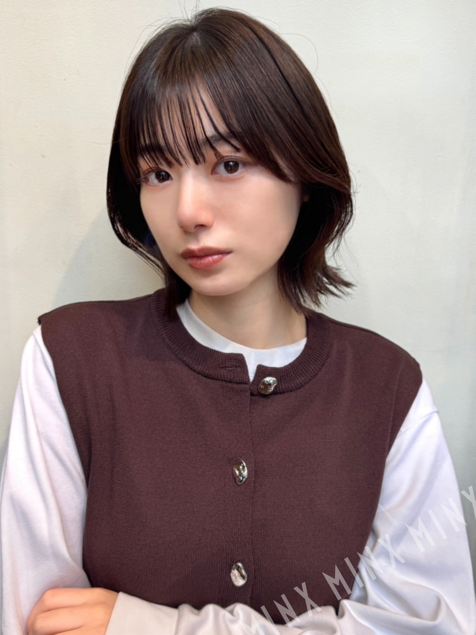 コンパクトなフォルムに軽めの前髪を合わせて、抜け感のあるスタイルに。