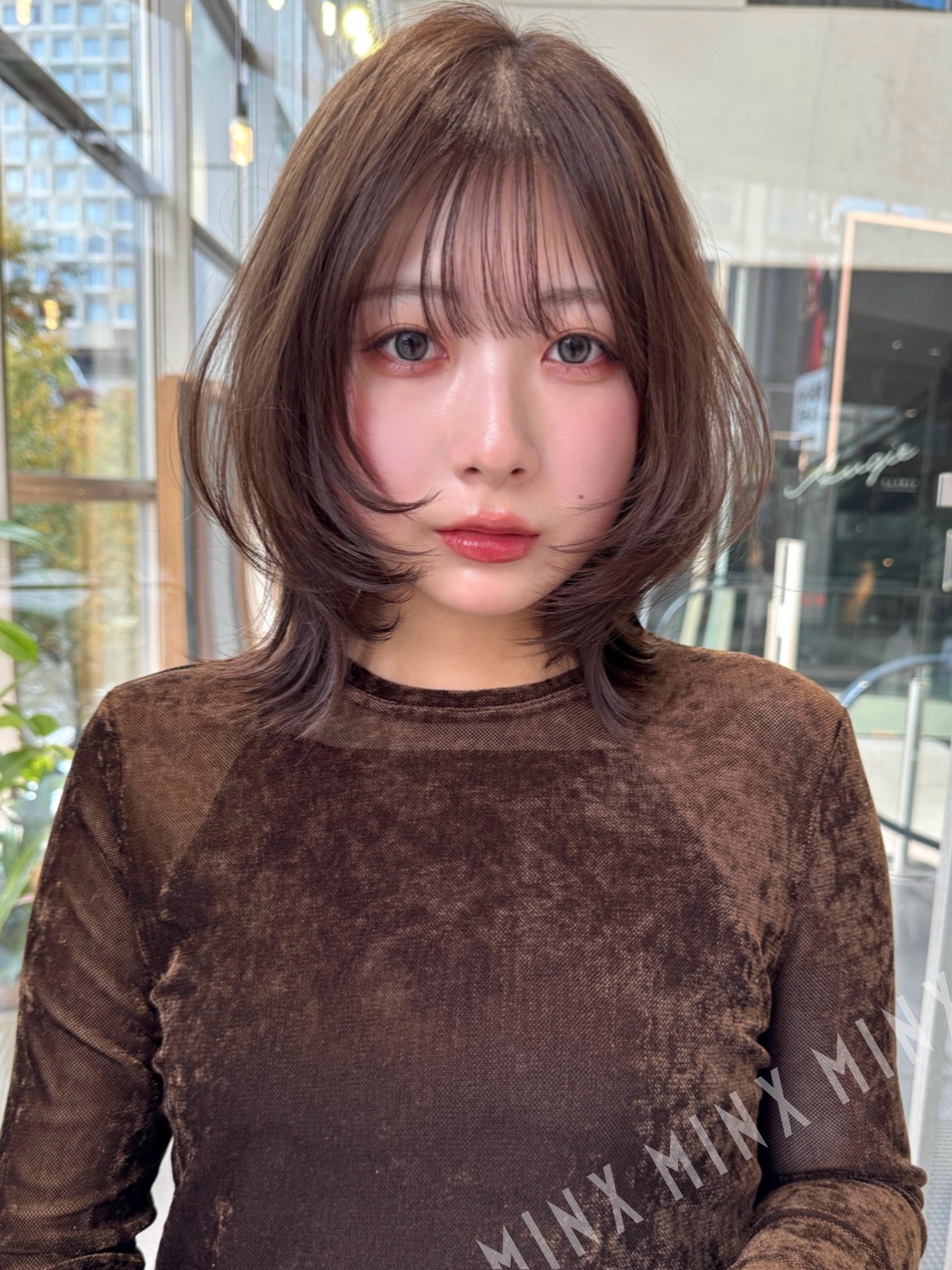 やわらかいブラウンカラーとシースルーバングで、透明感と抜け感を出します。