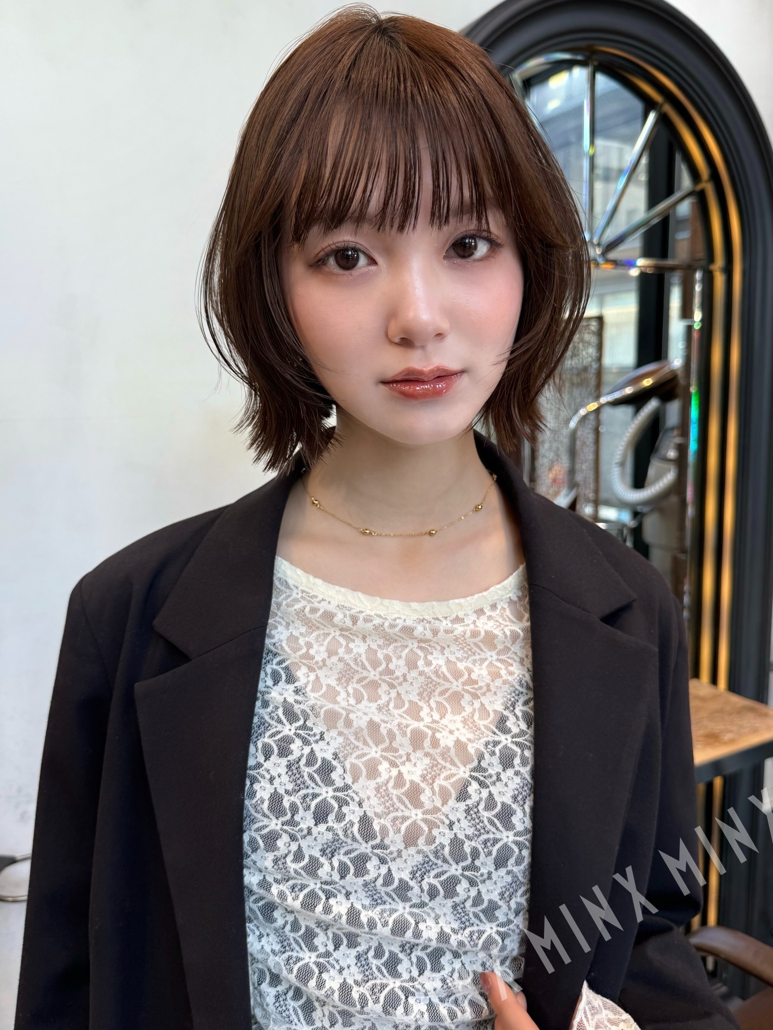 - 短めのボブスタイルに顔周り、トップのにレイヤーを入れてくびれるスタイルです。