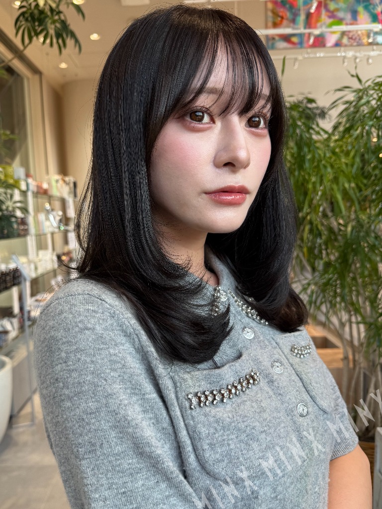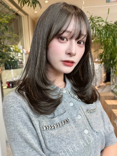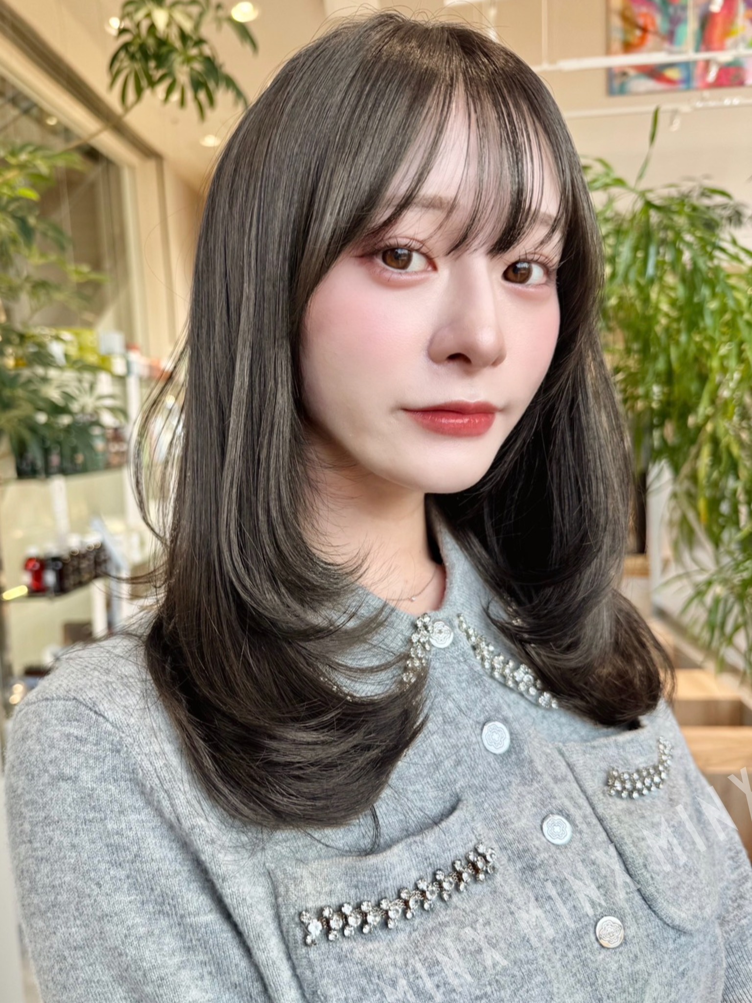 - 今期のトレンドミディアムのレイヤースタイル。グレージュカラーで抜け感をプラスしています。