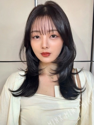 - セミロングのレイヤースタイルを外ハネと内巻きの動かしで、トレンド感のあるくびれスタイル。