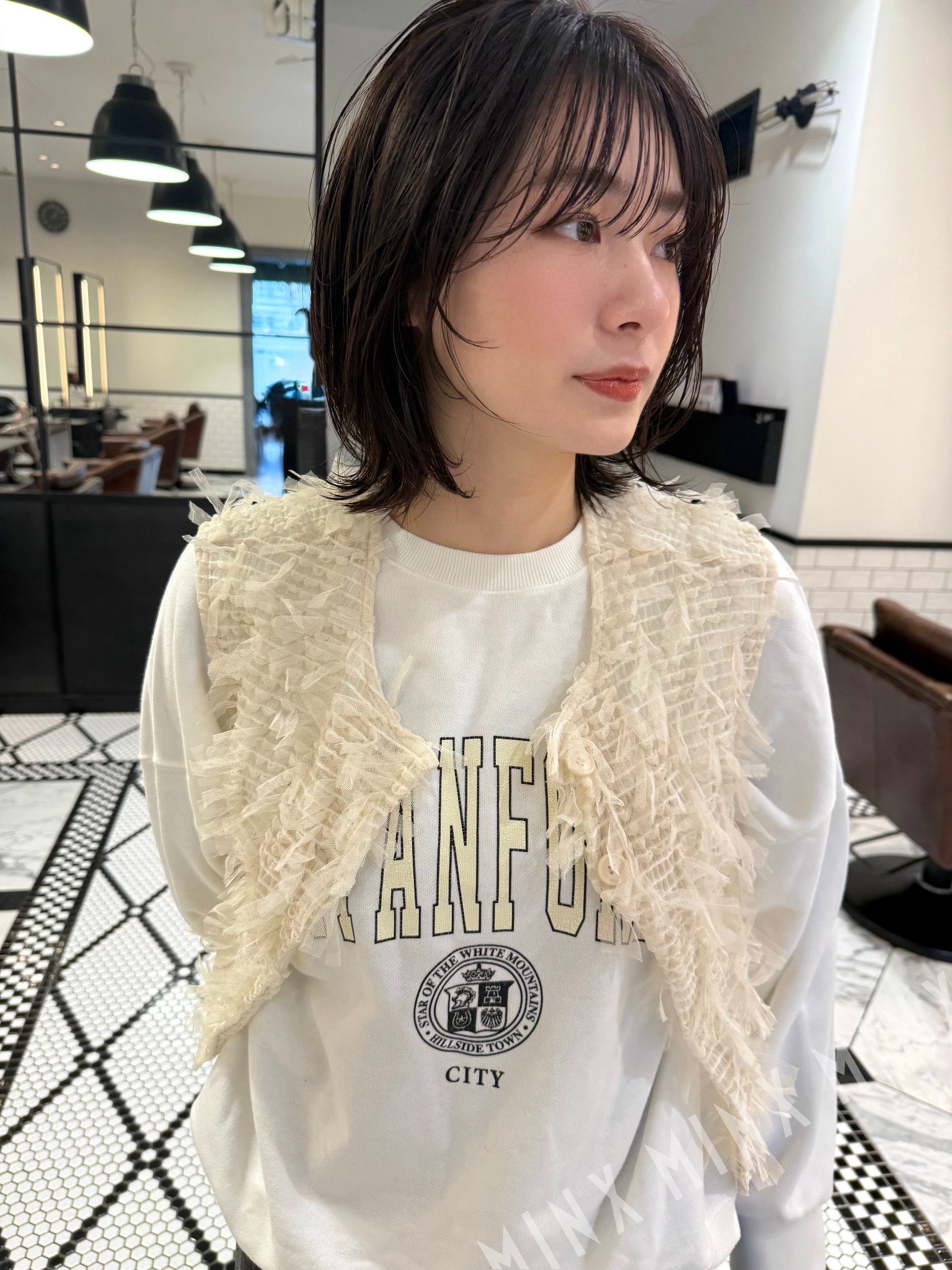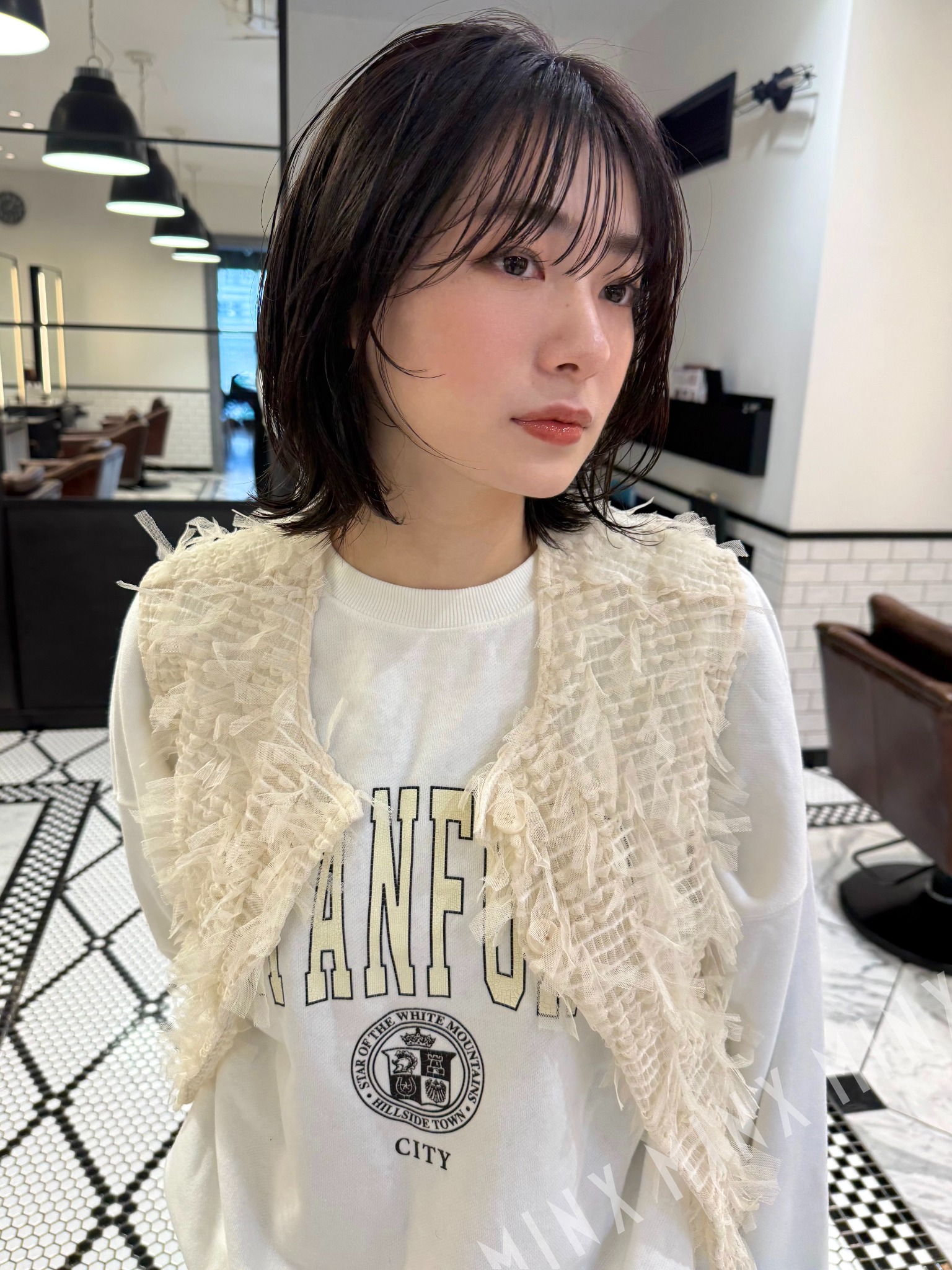 - 32ミリのコテでアウトラインを外ハネ顔周りを内巻き、サイドバングをリバースに流してヘアオイルでスタイリング