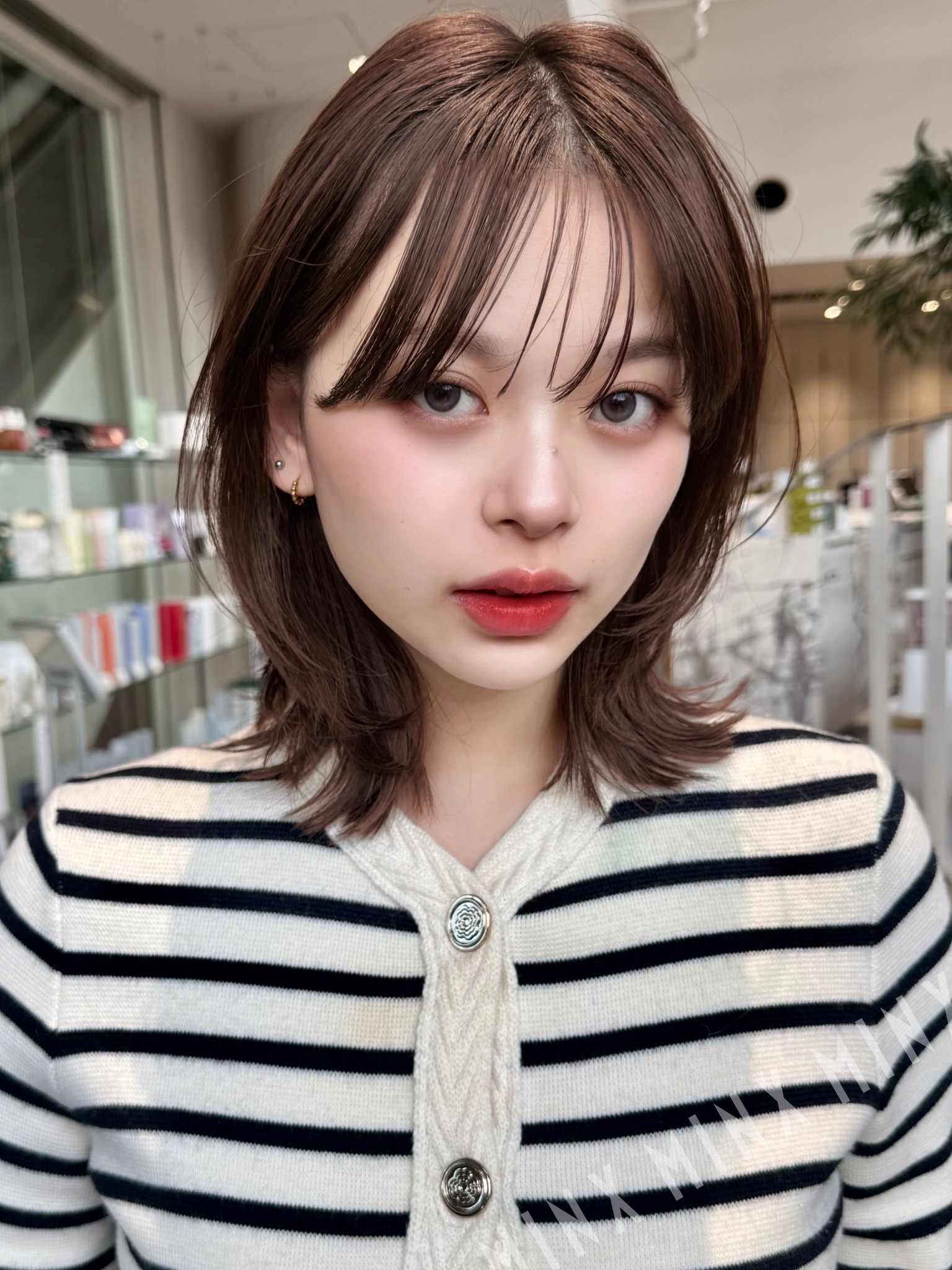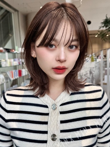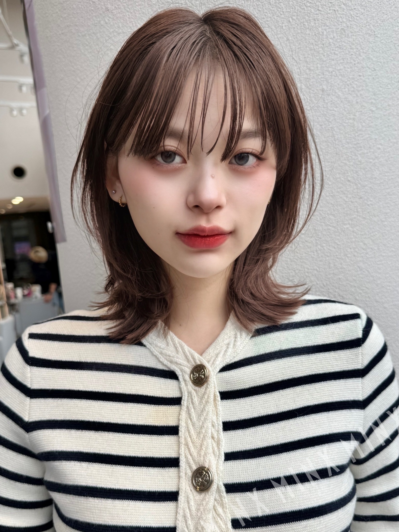 - カットで自然にくびれるようにカットし、顔の横にボリュームを作る事で小顔効果UP。