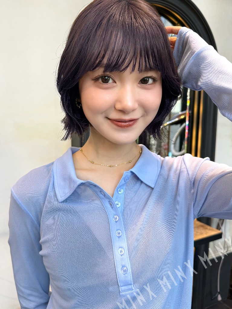 - ぱつっとボブにトップ、顔まわりにレイヤーを入れたくびれボブスタイル
