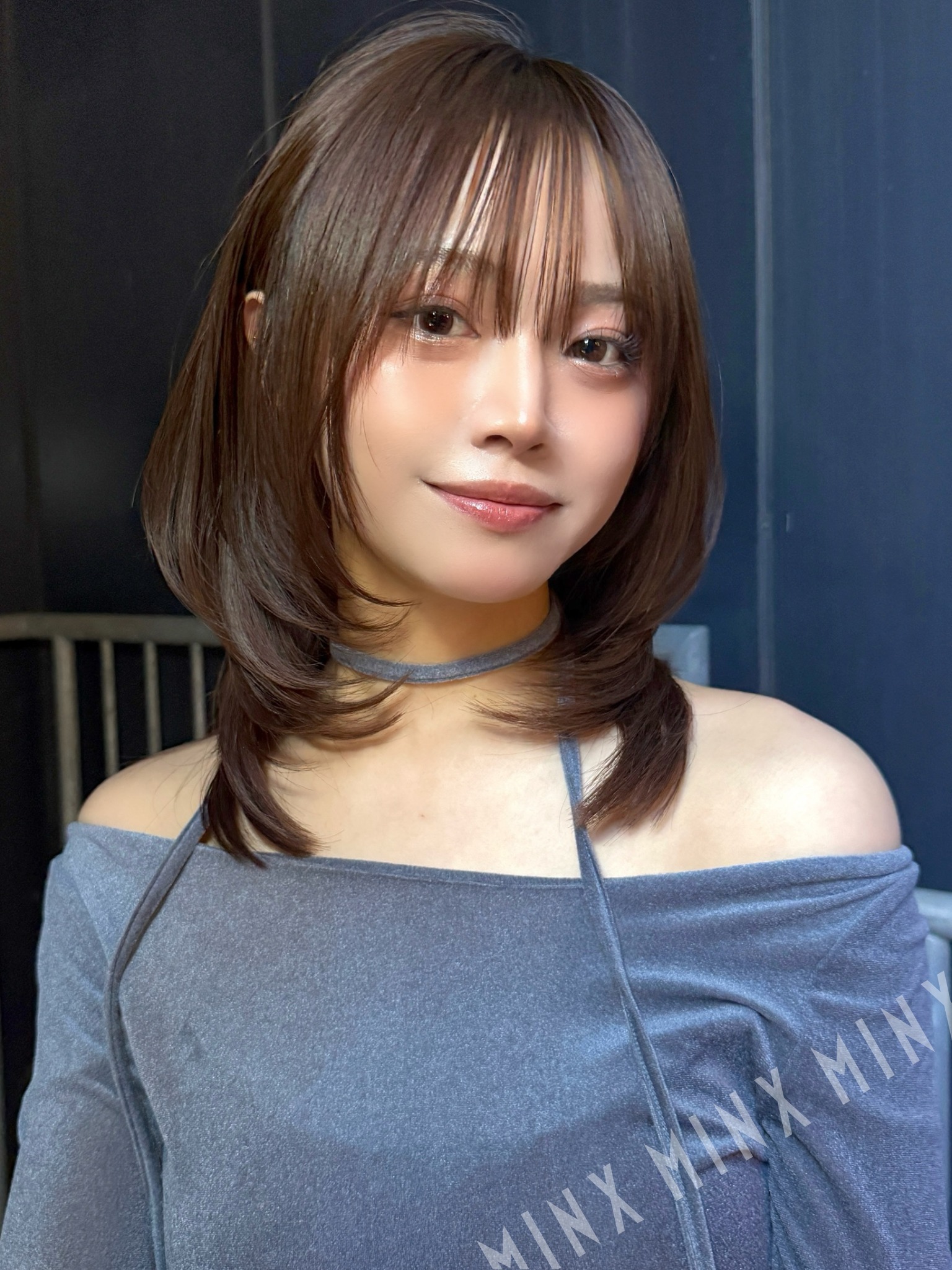 顔まわりから全体にかけて繋がるレイヤーを入れたミディアムスタイル。