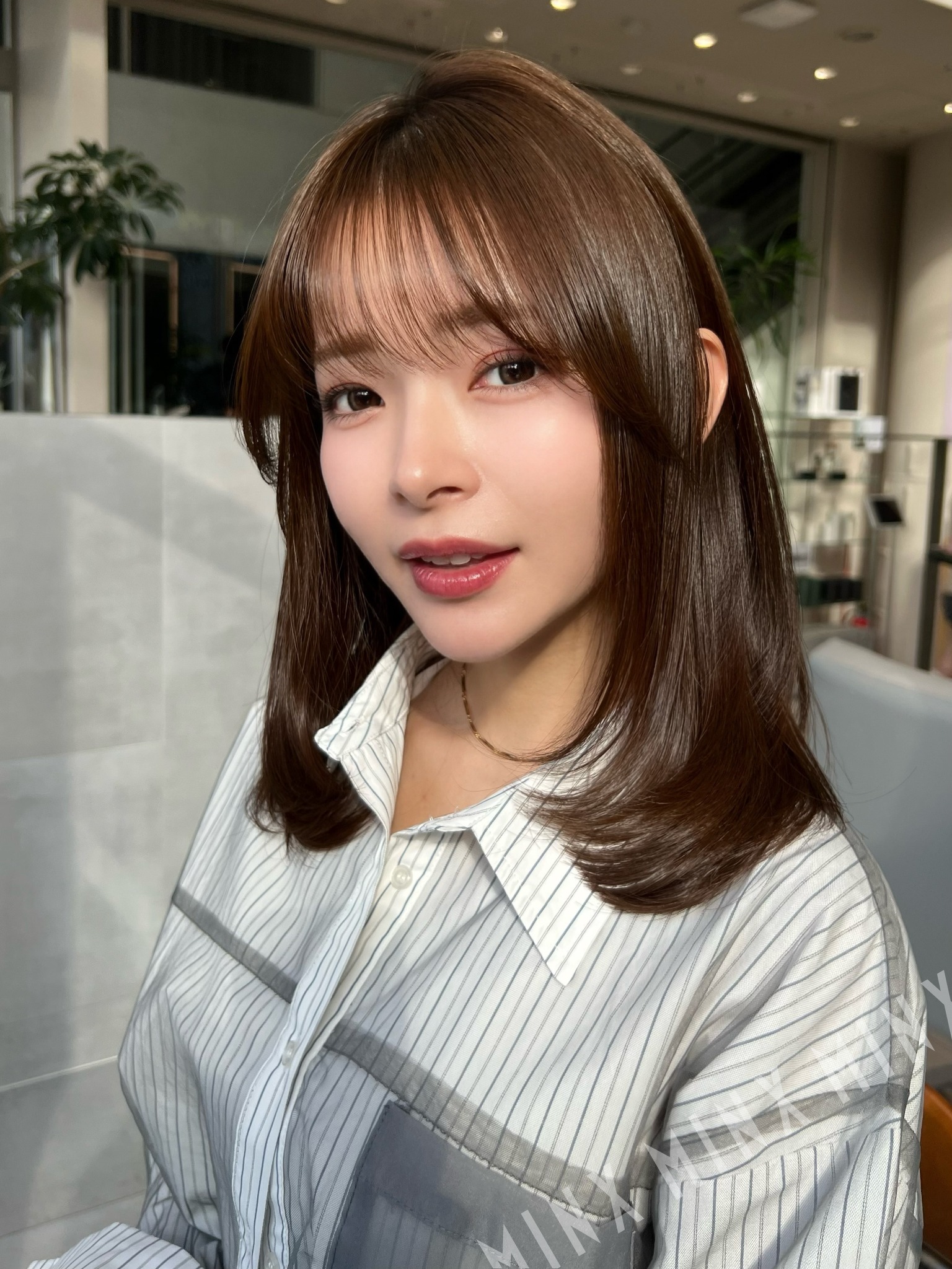 小顔効果抜群のフェイスレイヤーに透け感溢れるブラウンベージュで明るい雰囲気に。