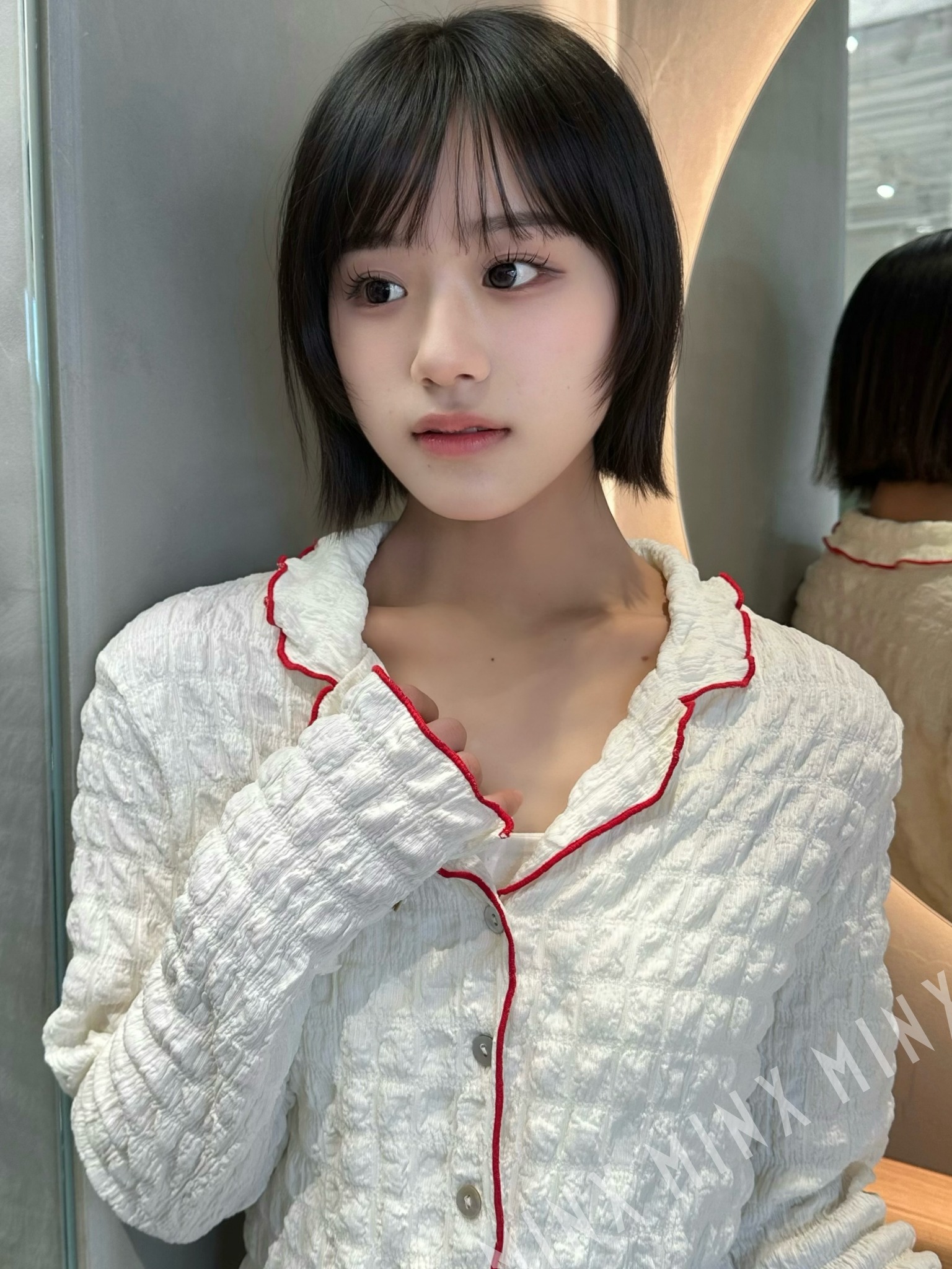 - あごラインのボブに、表面だけ軽くレイヤーを入れた外ハネボブ。