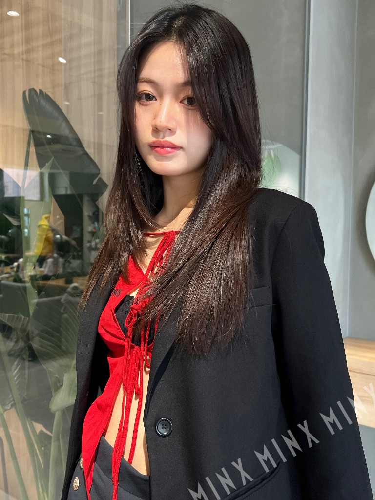 レイヤーは控えめで、毛先に自然な軽さを出すことで重くなりすぎず、クールさと女性らしさを両立。
