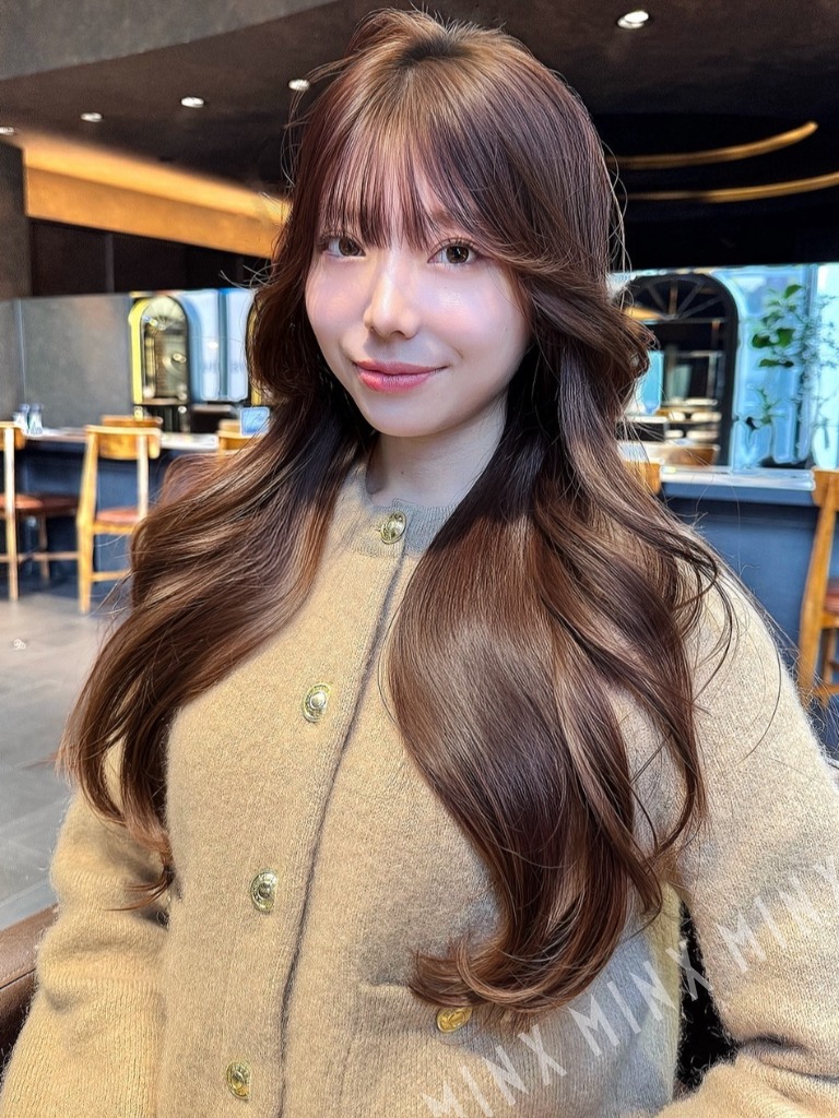 - 顔周りの大きな曲線でくびれを作る「ヨシンモリ」スタイル。胸元の大きなカールが華やかさと上品さを両立させます。透け感のある前髪とショコラベージュの艶感で、重さを感じさせない最新の韓国トレンドヘアです。