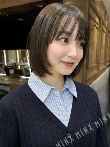 - 顎下の長さでボブ。小顔になるレイヤーを顔周りに沿っていれます。前髪はシースルーで少し長めに大人っぽく!