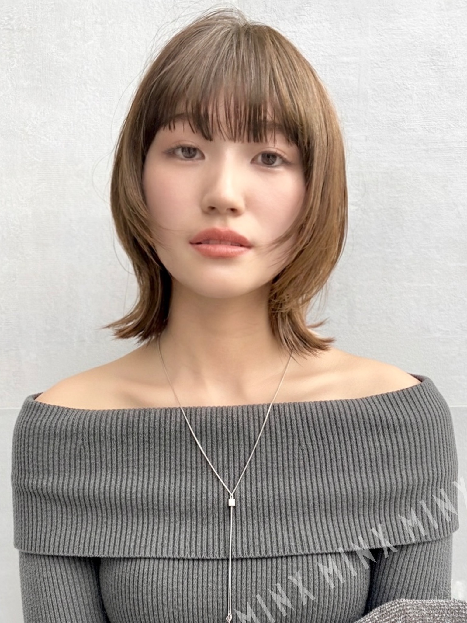 - 柔らかなくびれシルエットに、透け感カラーで大人のこなれ感をプラス。顔まわりのレイヤーとシースルーバングで小顔見えも◎耳かけアレンジもできて、オフィスでも休日でも好印象な万能ボブです。
