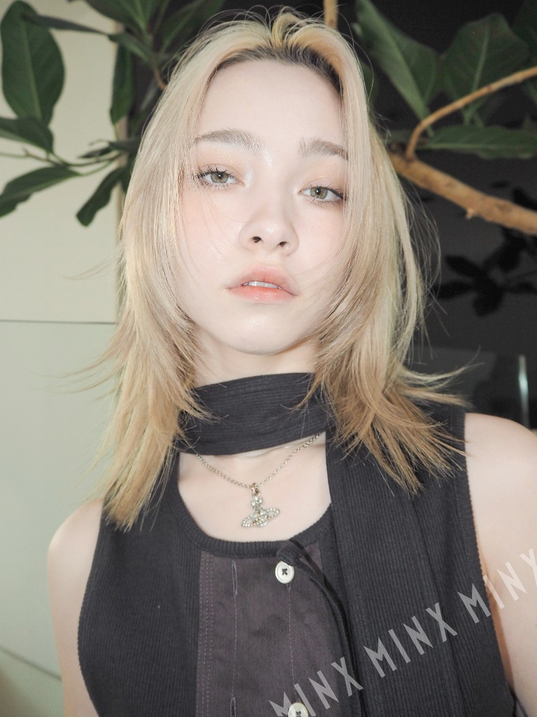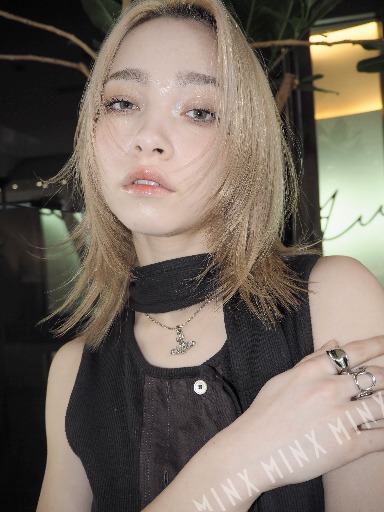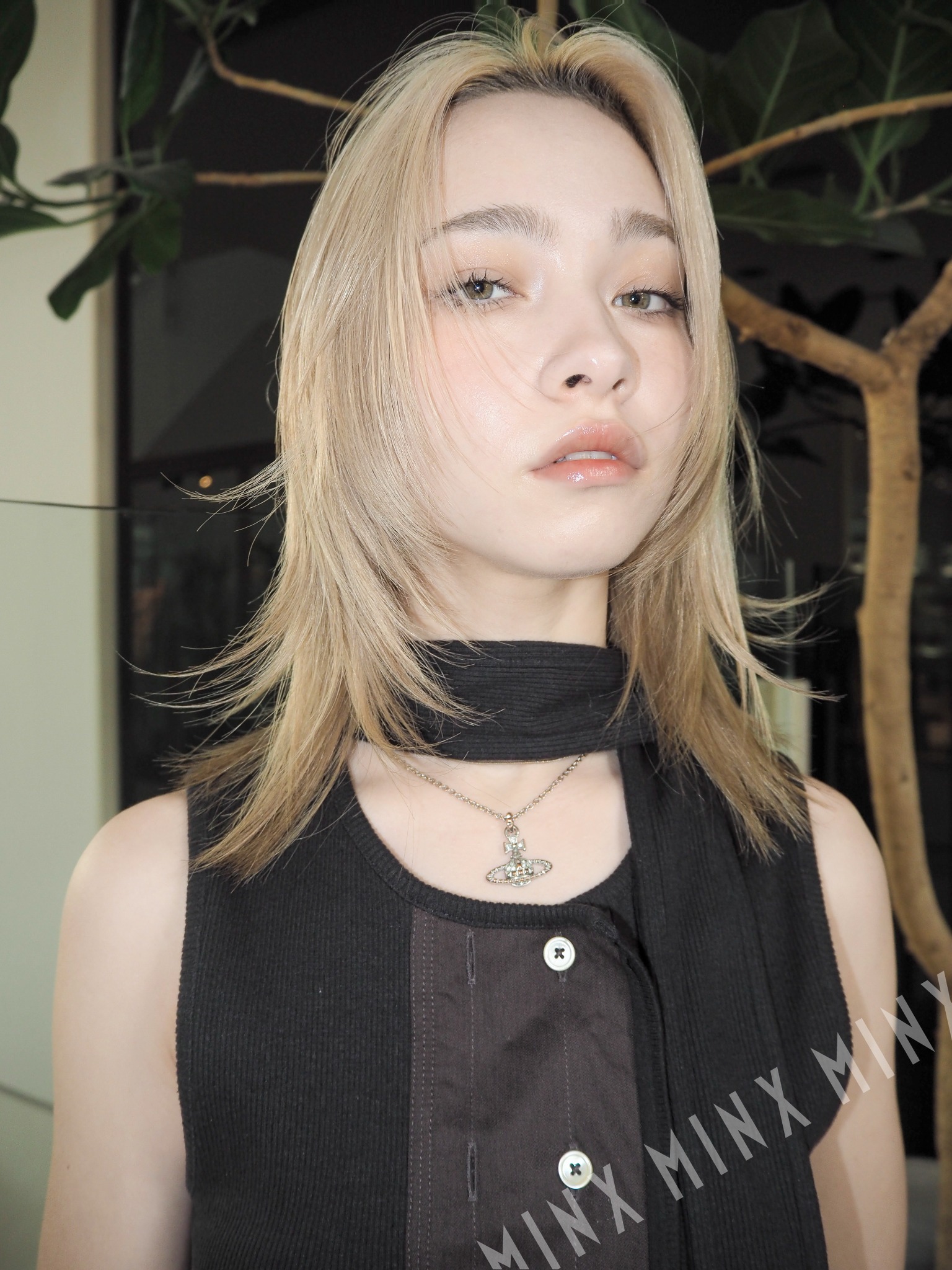 - 顔まわりを自然なストレートで自然に外にはねているようにスタイリングしました。