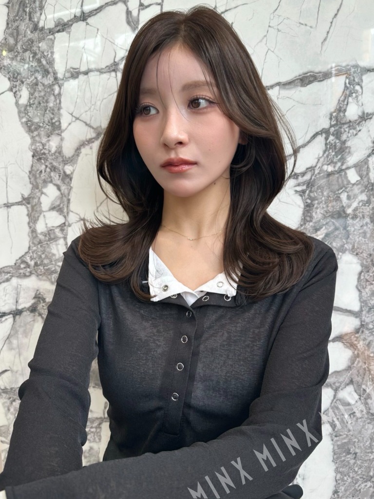- 今季トレンドのミディアムレイヤーとシースルーバングを組み合わせて大人っぽく、透け感のあるスタイを作りました!よりひし形のシルエットを作れるように耳をかけて動きを出すことがポイントです!