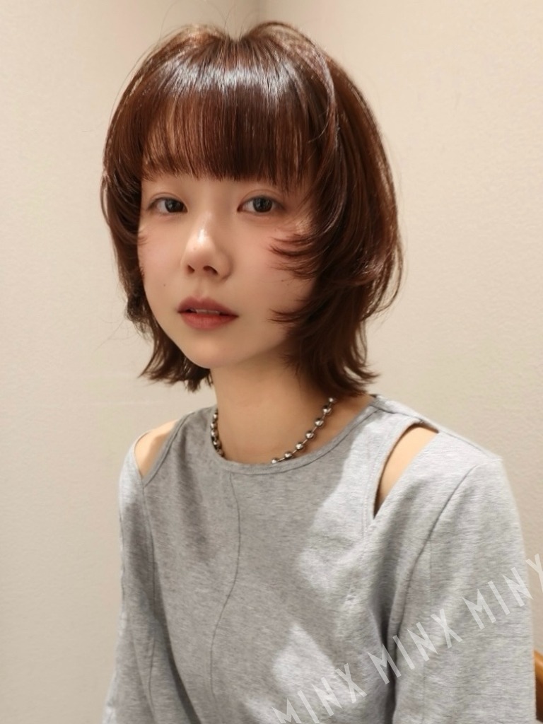 - 顔まわりにしっかりレイヤーを入れた軽さのあるボブウルフ。