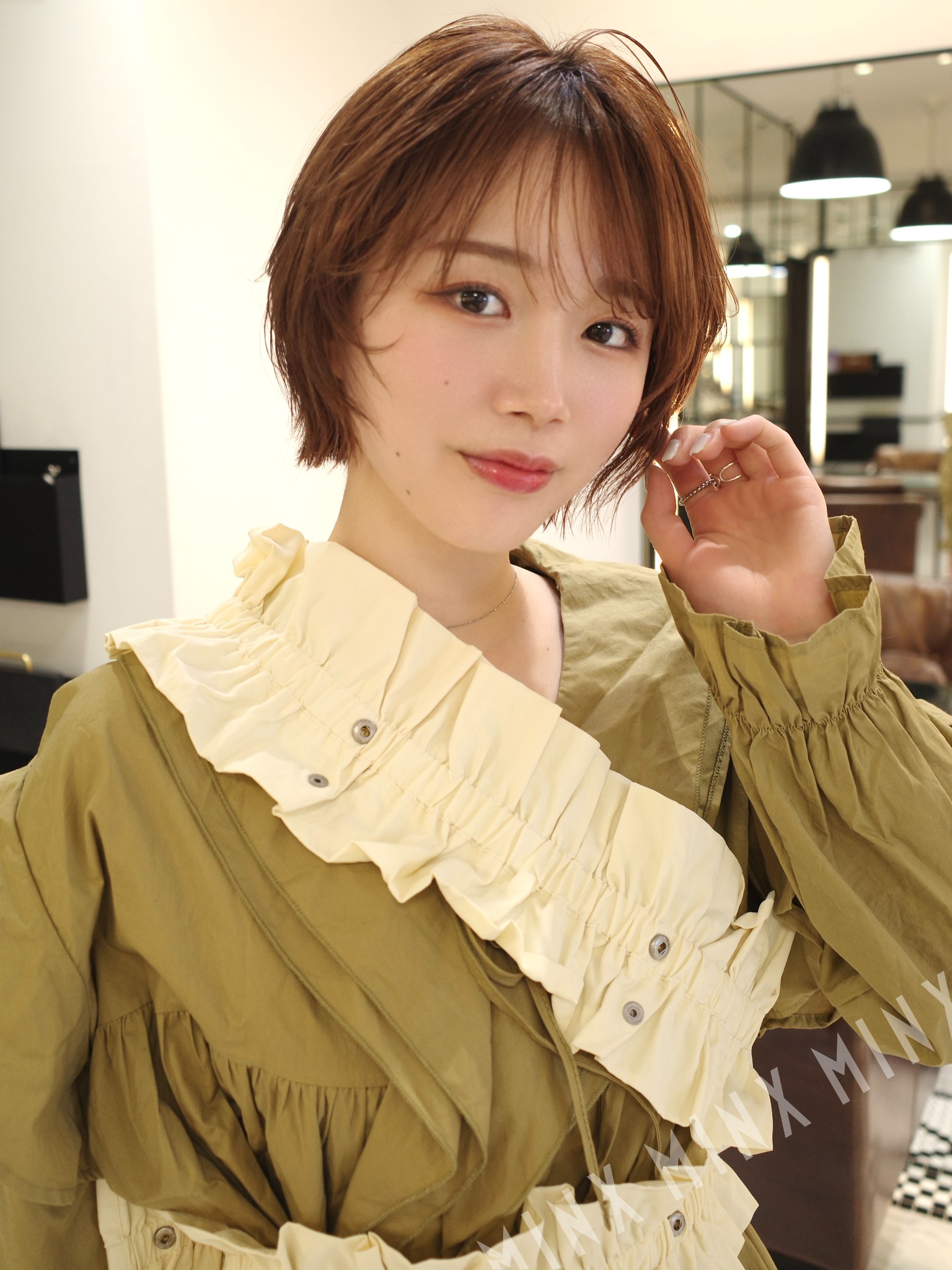 - 顎ラインのボブベースに顔周りからレイヤーを入れたヘアスタイル