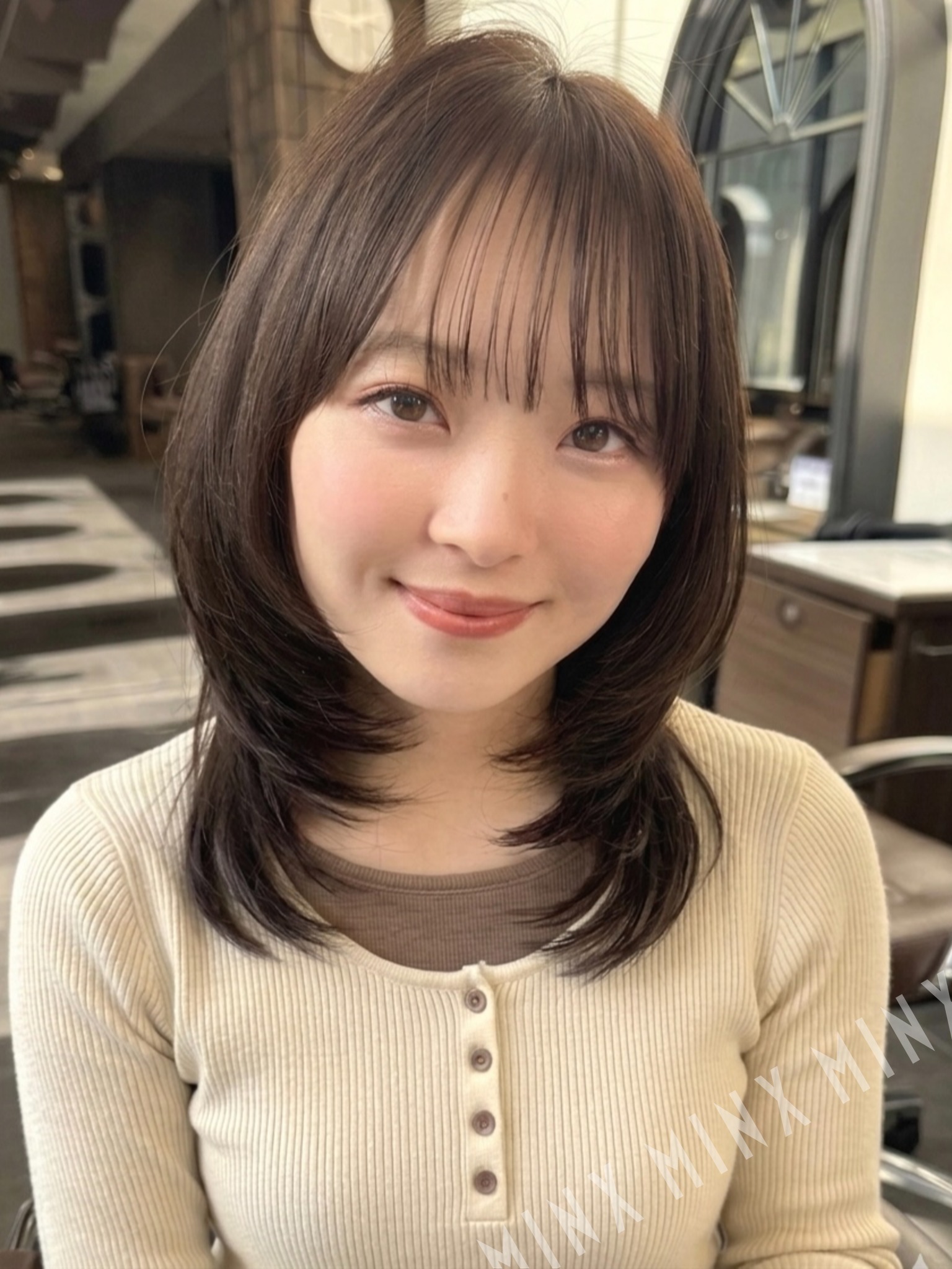 - 口と顎の間からザクザクレイヤーを入れてワンカールでも可愛くなるようカットします。