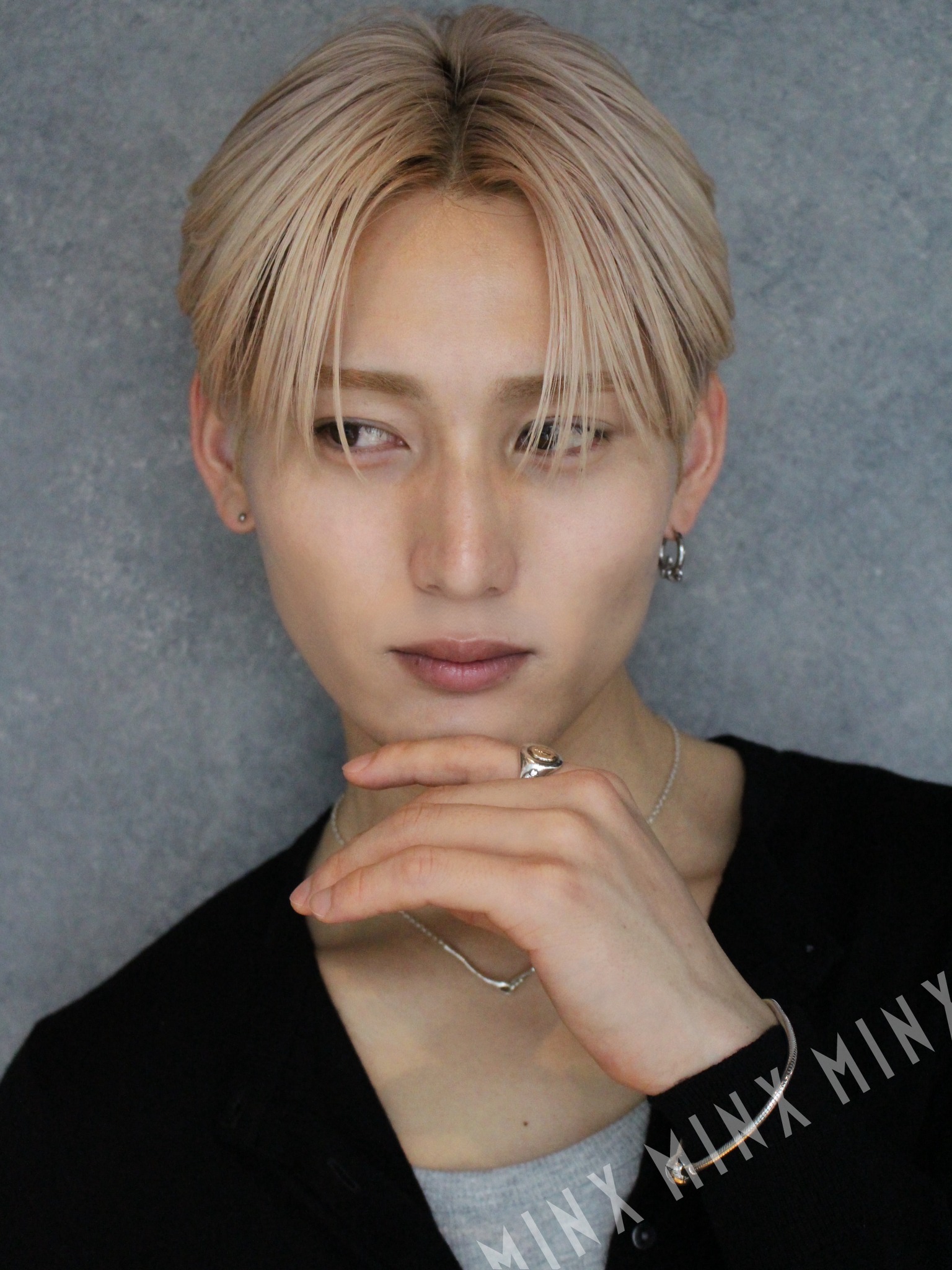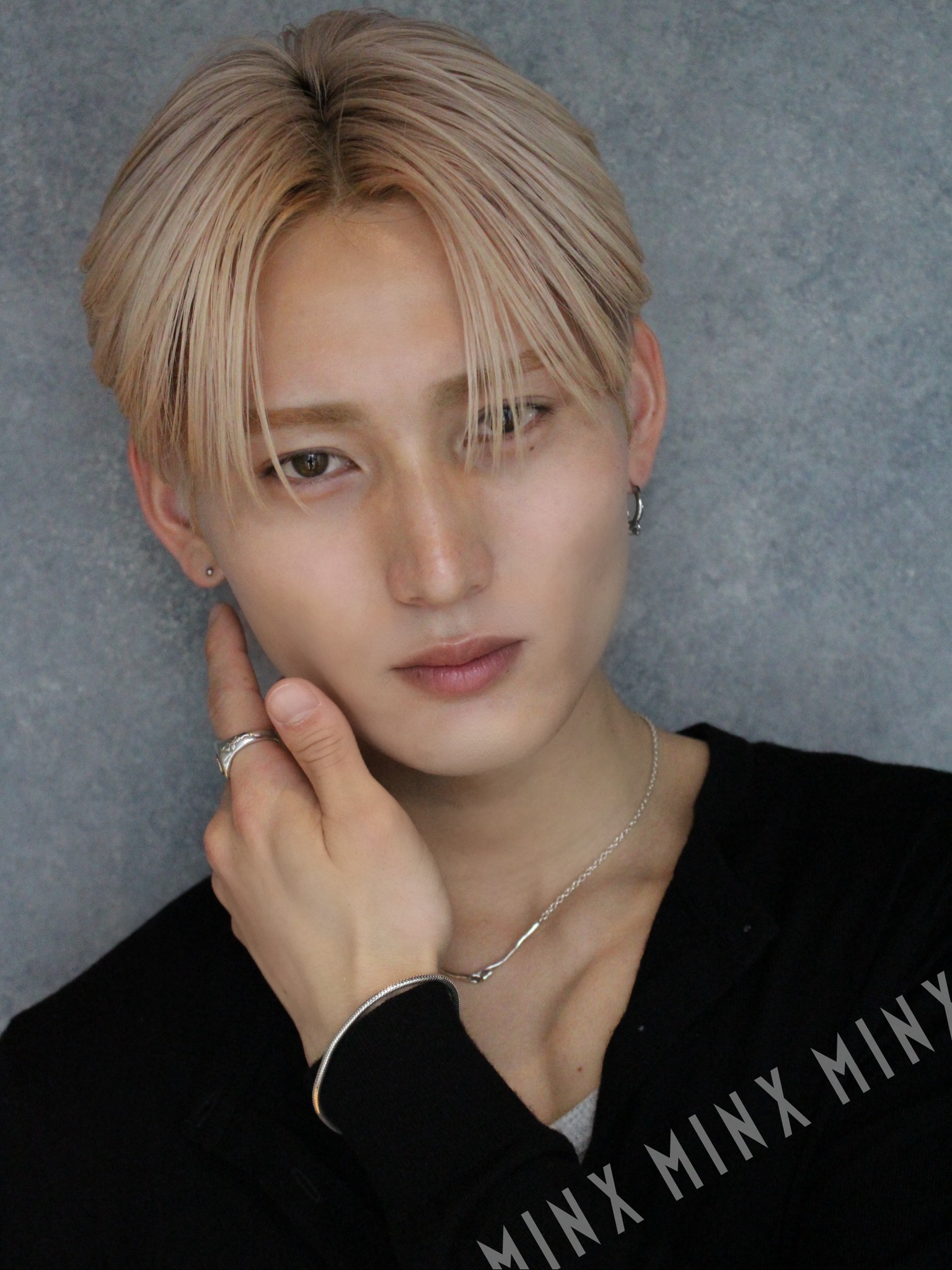 - 目元にパラっとかかる「こぼれバング」が最大のポイントです。かっちり分けすぎず、あえて隙間を作ることで、ハイトーンカラー特有の透明感を際立たせ、アンニュイで色気のある雰囲気を演出しています。