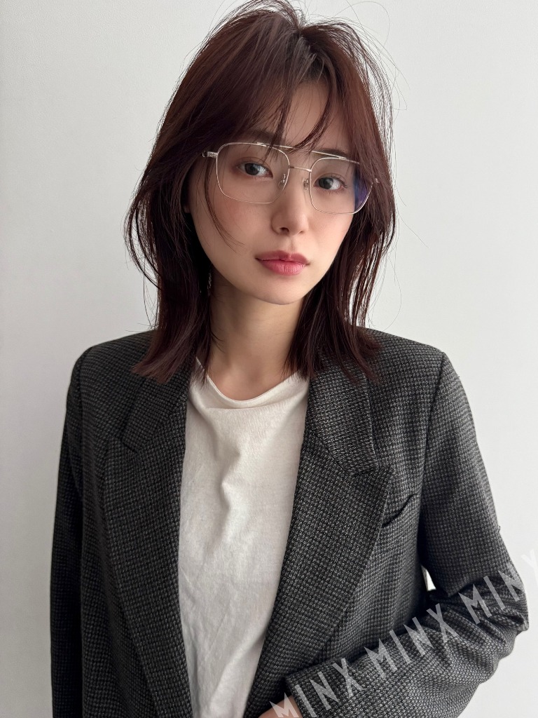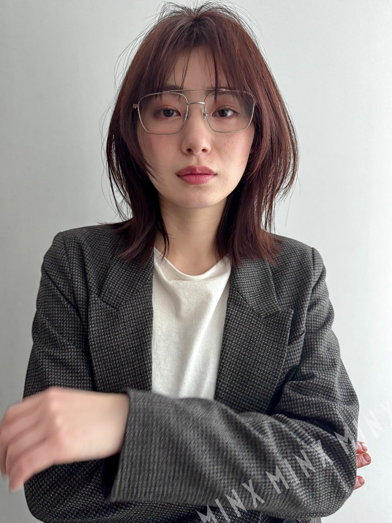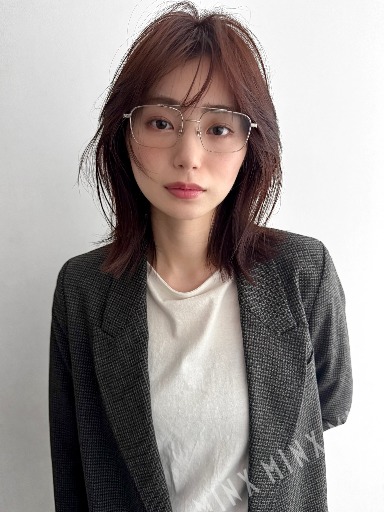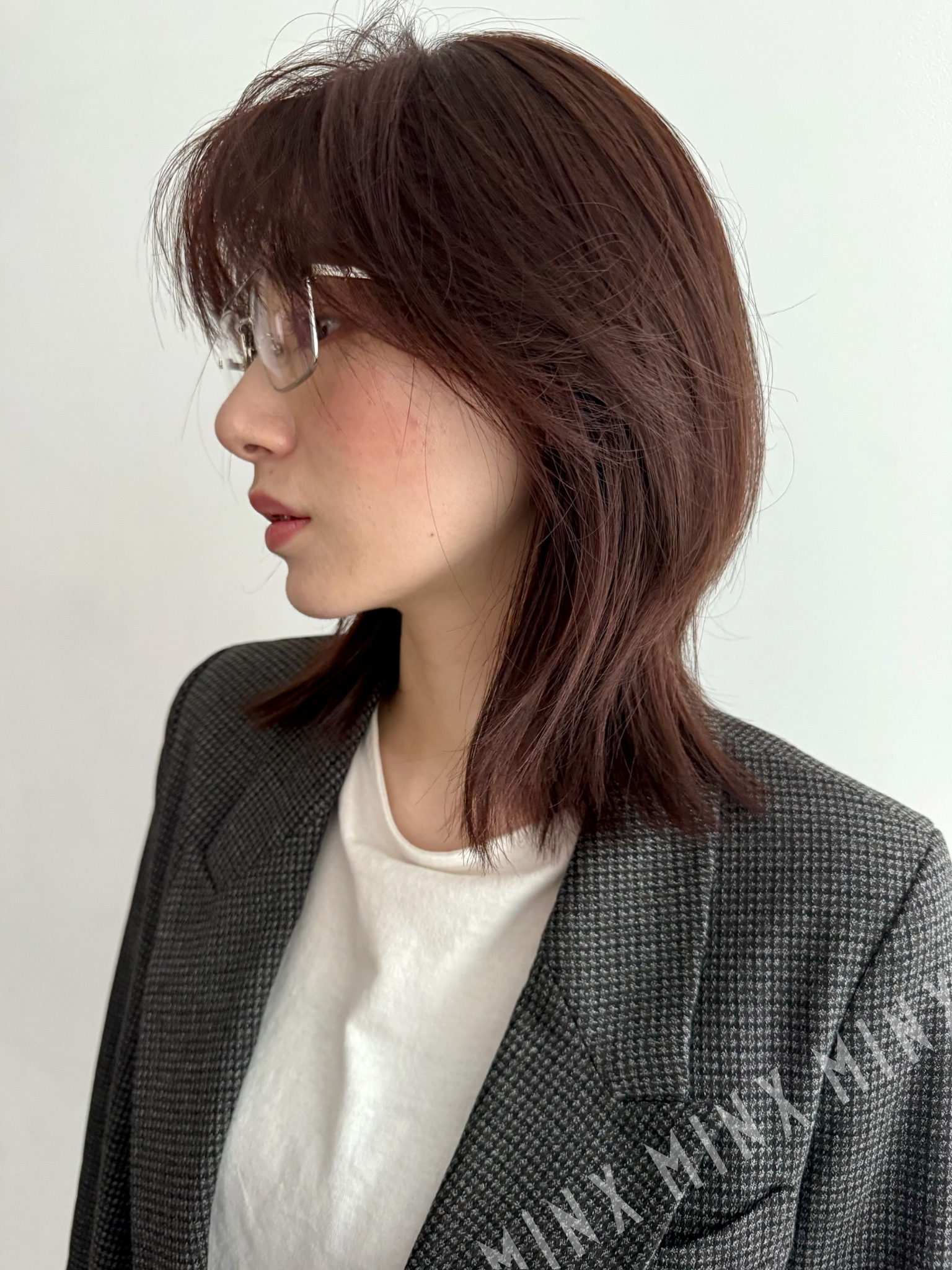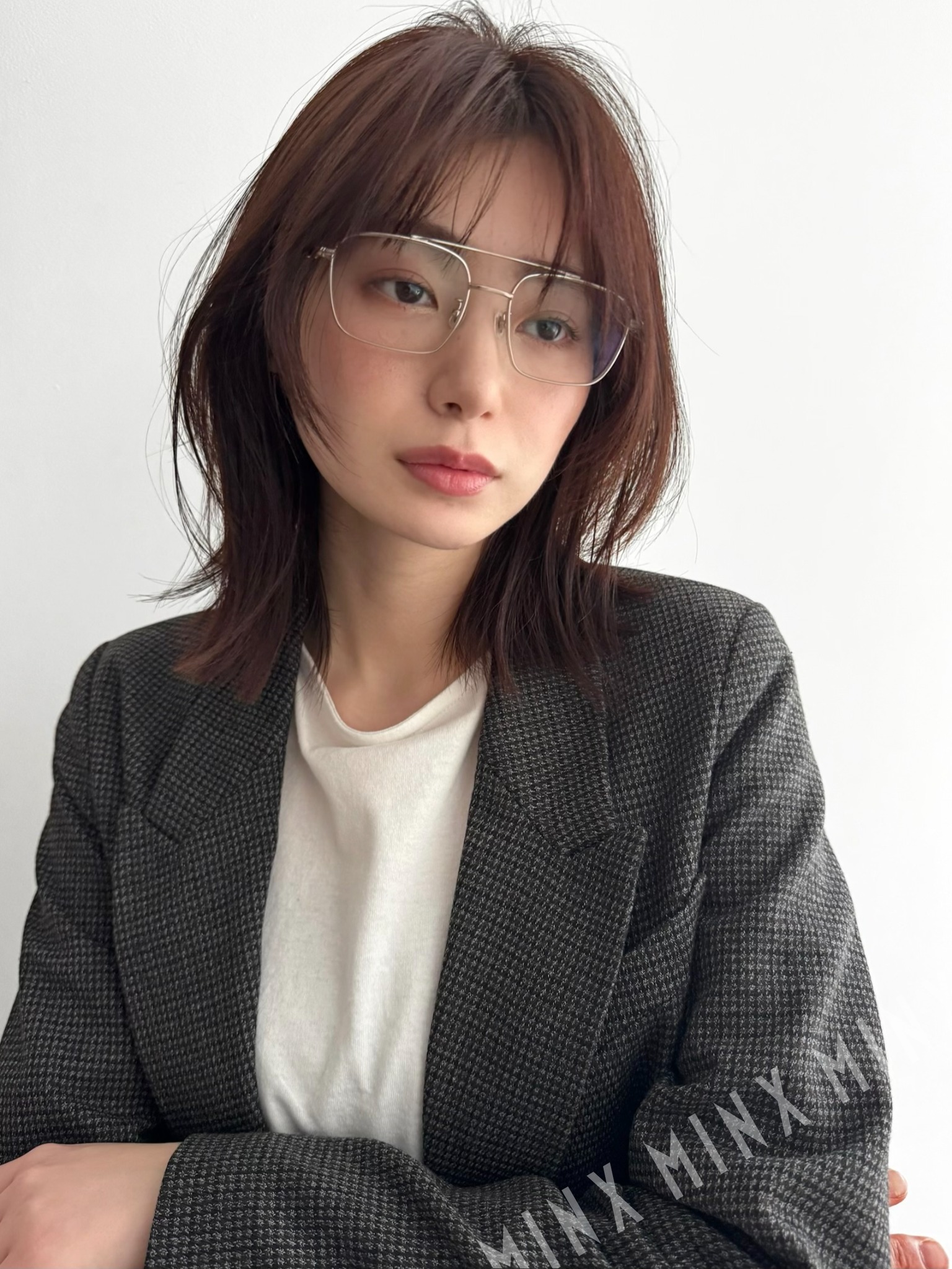 - ストレートアイロンで顔周りのレイヤーを生かして柔らかく、毛先は軽く外ハネに。